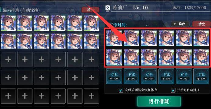 使用排版功能可一键开工,其中温泉(竹)的泡澡位(红框内)一定优先开满,不推荐开工作位(蓝框内)。如开了工作位,可延长一次开工的时长(但仍不能无限挂机)。