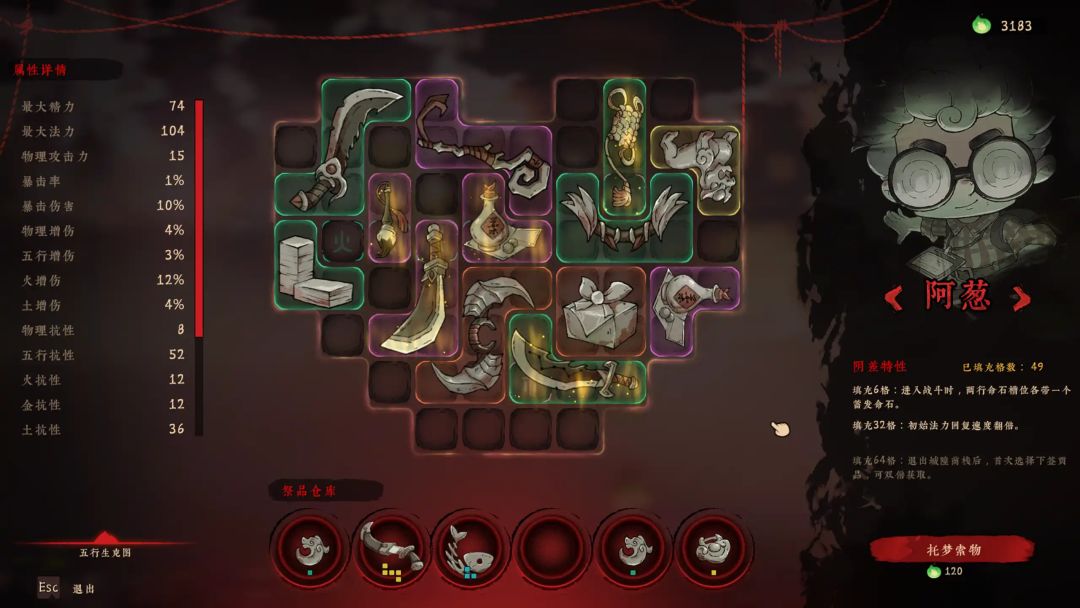 除了类幸存者玩法外,游戏内还加入了背包管理的玩法。每名角色都有三个特性,这些特性需要玩家把抽取到的装备填充满角色背包才能生效,最高的特性需要把全部背包格子填满!这些装备还都有着五行属性,要是放置到位,可以触发背包中的五行格子来提升装备效果。