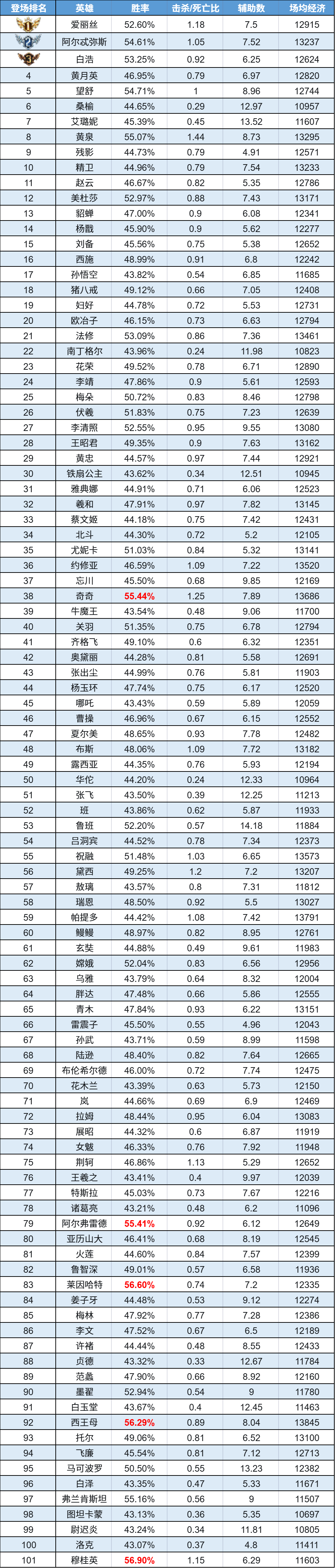 【高段位】辅助艾璐妮本周超越爱丽丝,登顶热度榜;胜率榜较量激烈,诸葛亮胜率飙升跻身TOP1,黛西以微弱优势力压黄泉;奇奇经济榜实现三连冠。