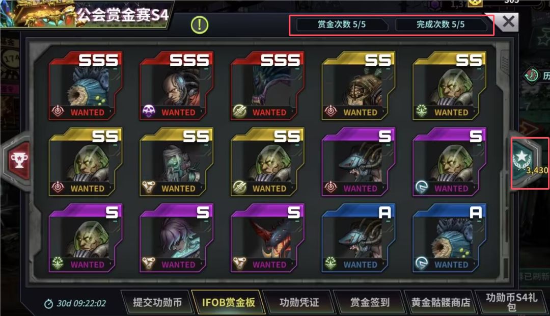 2.2.玩家每天可以选择赏金板上的任务进行挑战,挑战的前5次无论是否完成均可获得功勋币S4奖励,每次固定30个,之后挑战无功勋币S4奖励