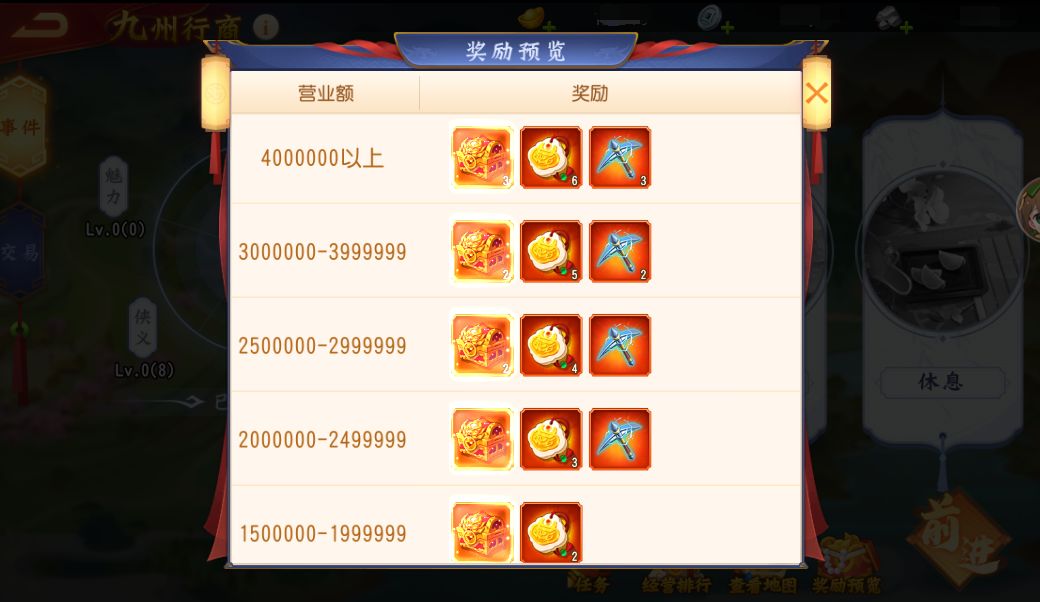 营业奖励:主公每次行进至终点,可对本轮行商进行结算,根据本轮获得的营业额获得对应的营业奖励。