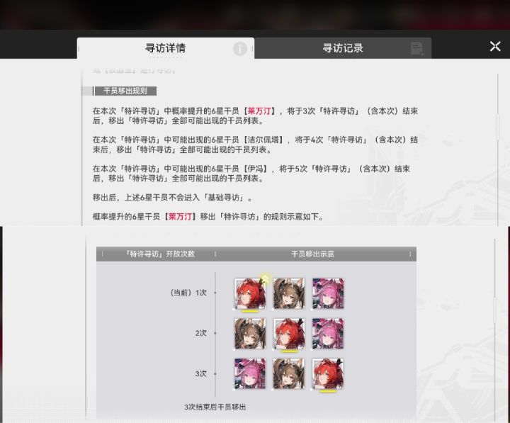 而根据卡池详情的【干员移出规则】(图3),经过公测版本的三个池,42因没有次数而被移出,杰哥还有1次,伊冯还有2次;