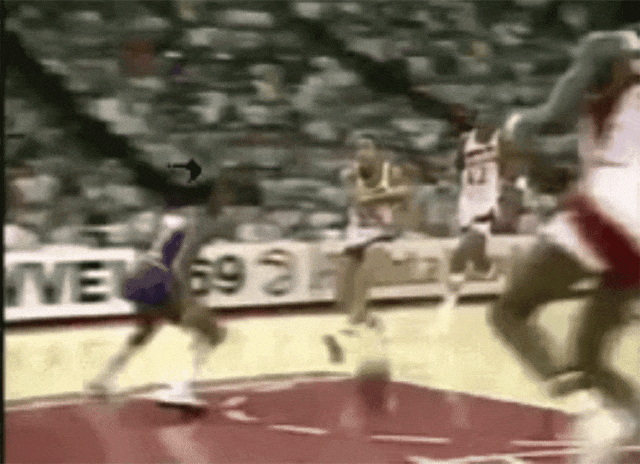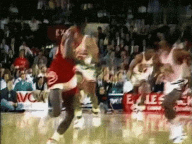 倒是在扣篮操作方面,威尔金斯别出心裁的玩了点花样——特有的胸前折叠扣篮,堪称招牌的跳步扣篮,以及动作行云流水的大风车。胸前折叠算得上是威尔金斯对于拉杆扣篮的一点小创新——他真的太喜欢拉杆扣篮了,且不介意用拉杆/折叠扣篮来隔扣对方,在实战中往往可以看到威尔金斯将球举起的同时自身也抛向空中,随后将球在胸口折叠躲过对方长人的臂膀后,再次举起灌进篮筐。那些年成为威尔金斯背景板的人里,DPOY不在少数,而威尔金斯用着他这一招鲜吃遍天的折叠拉杆扣篮技巧,飞跃了马克伊顿,上将,尤因,莫宁,麦克海尔,酋长等一系列内线大闸。面对他的扣篮,这些内线大闸仿佛在迎合他的扣篮,为他做了一场生动的个人秀,这得益于威尔金斯顶尖的滞空能力和腰腹力量,也归结于他对扣篮的极致把握。