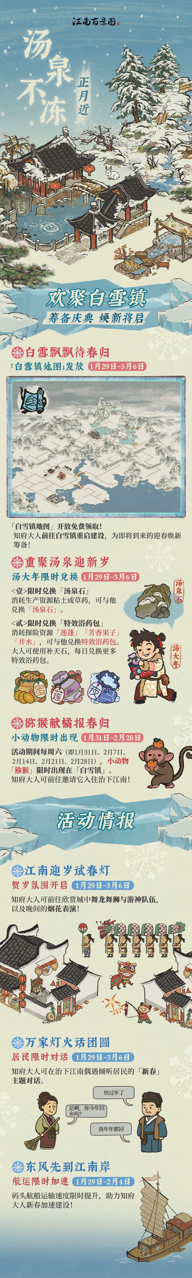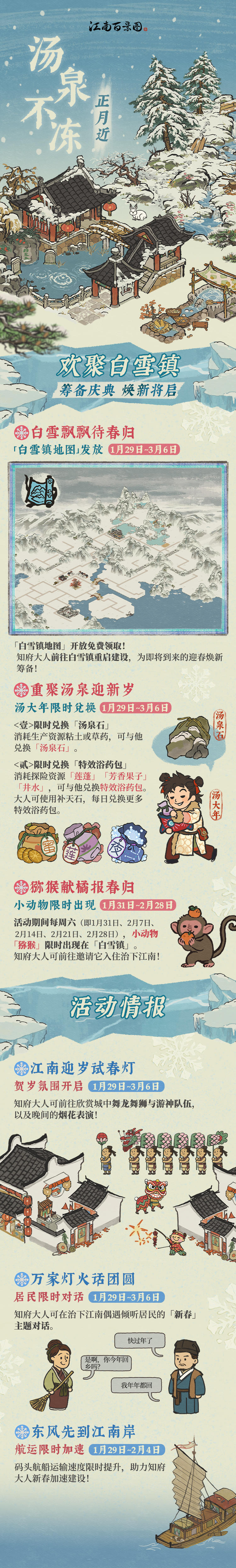 1月29日起,#江南百景图 「白雪镇」开启先行体验,知府大人可抢先前往筹备,静待热闹欢腾的「新春庆典」启幕~