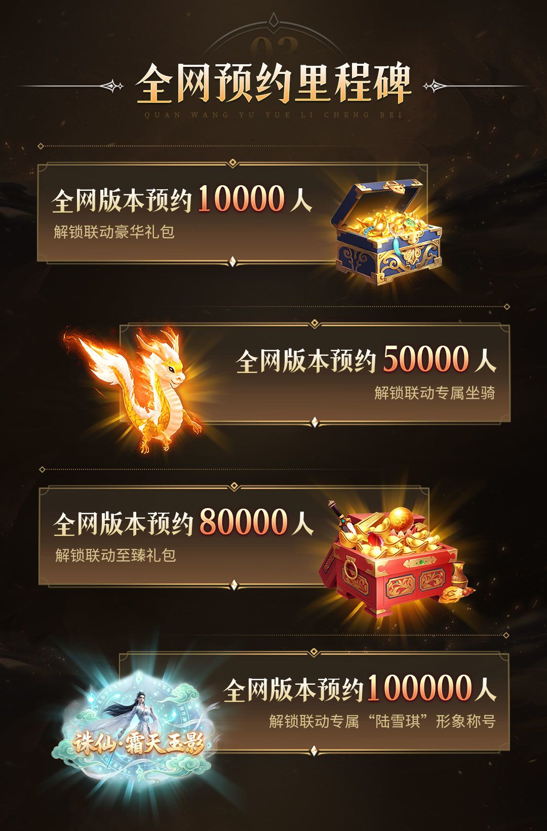 全渠道开启预约里程碑活动!当预约人数达到特定目标时,所有参与预约的玩家还将获得额外惊喜礼包,还有联动坐骑、新形象称号等奖励,等你来拿!