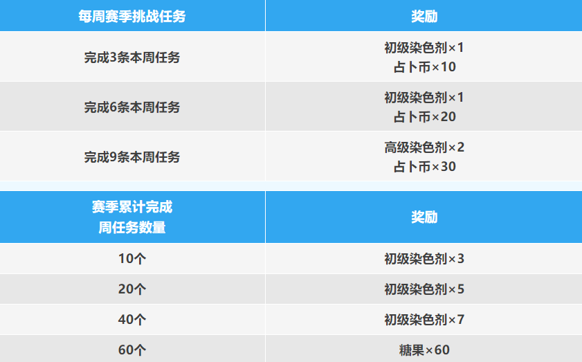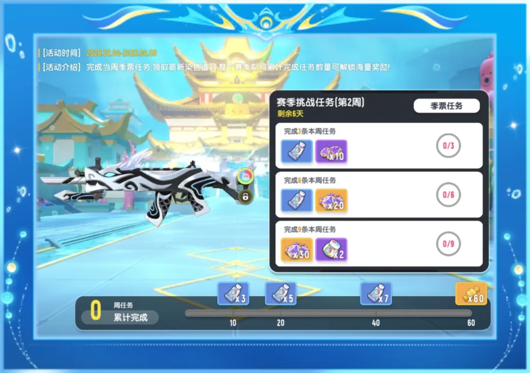 完成每周季票任务领取染色道具整个赛季期间累计完成周任务数量可解锁海量奖励!