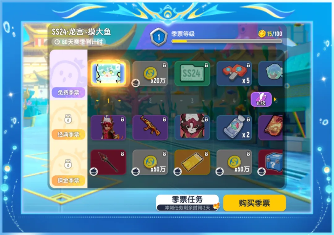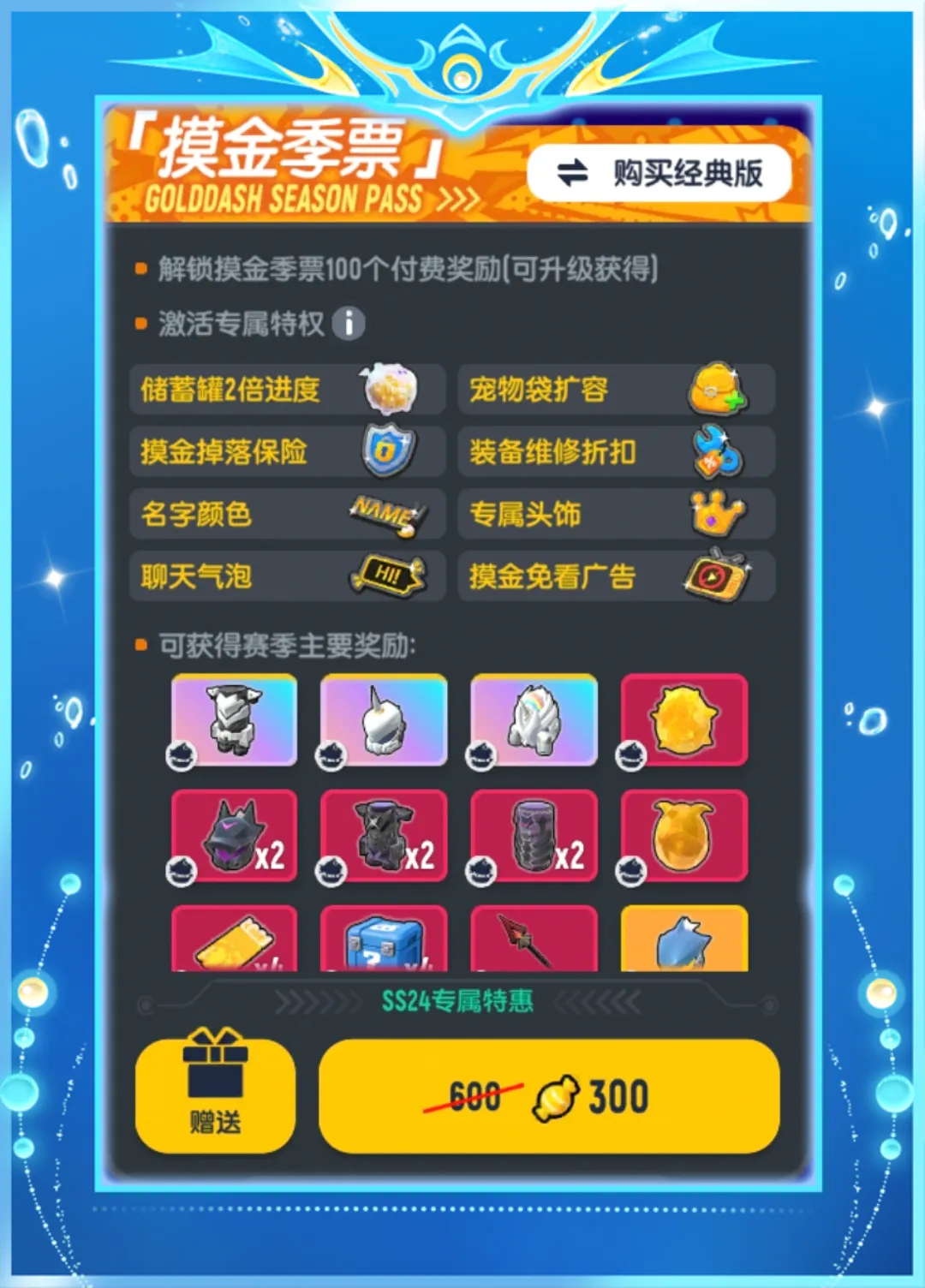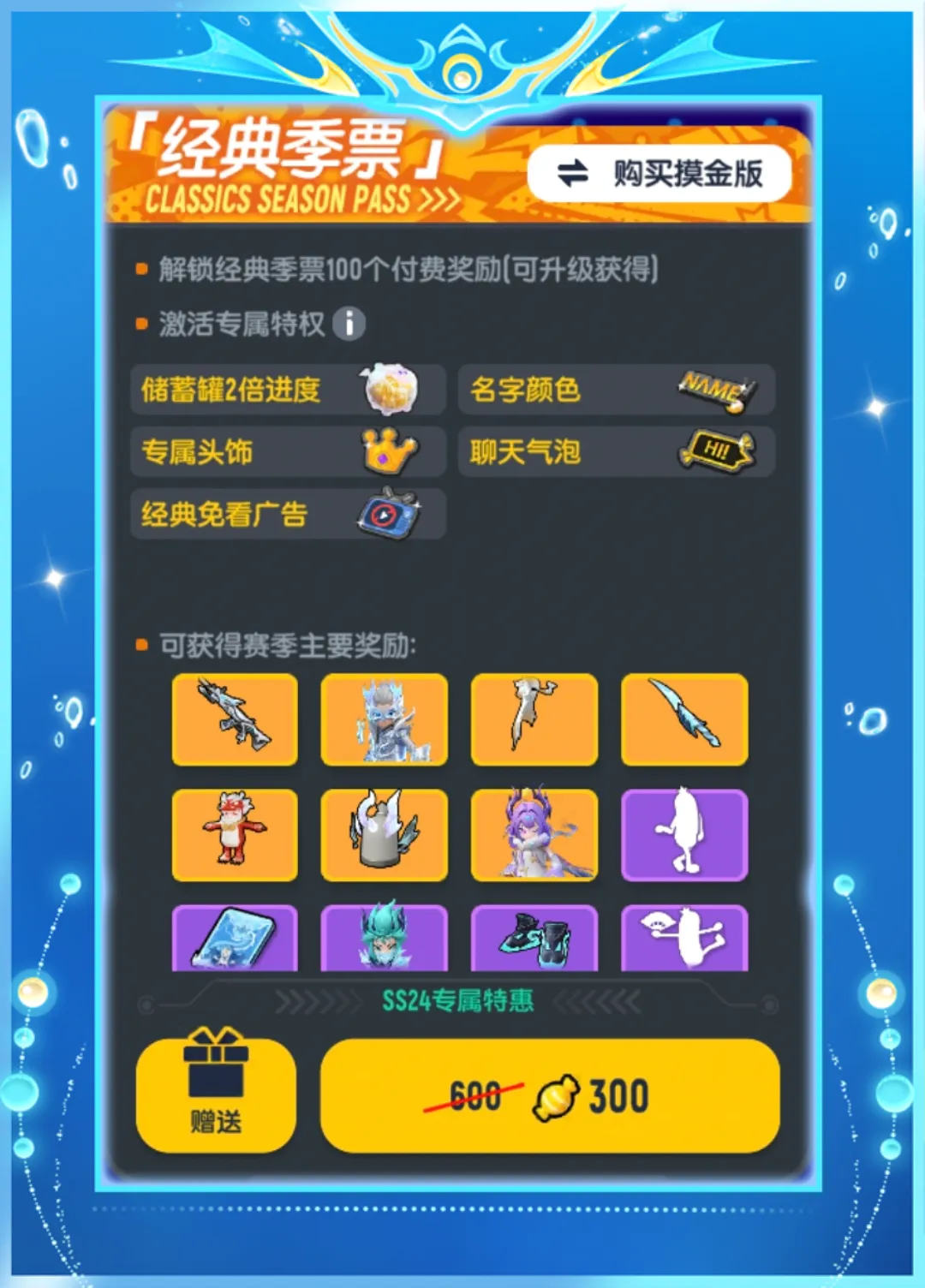 购买经典季票可获得储蓄罐2倍进度、名字颜色、专属头饰、聊天气泡、经典免看广告等特权