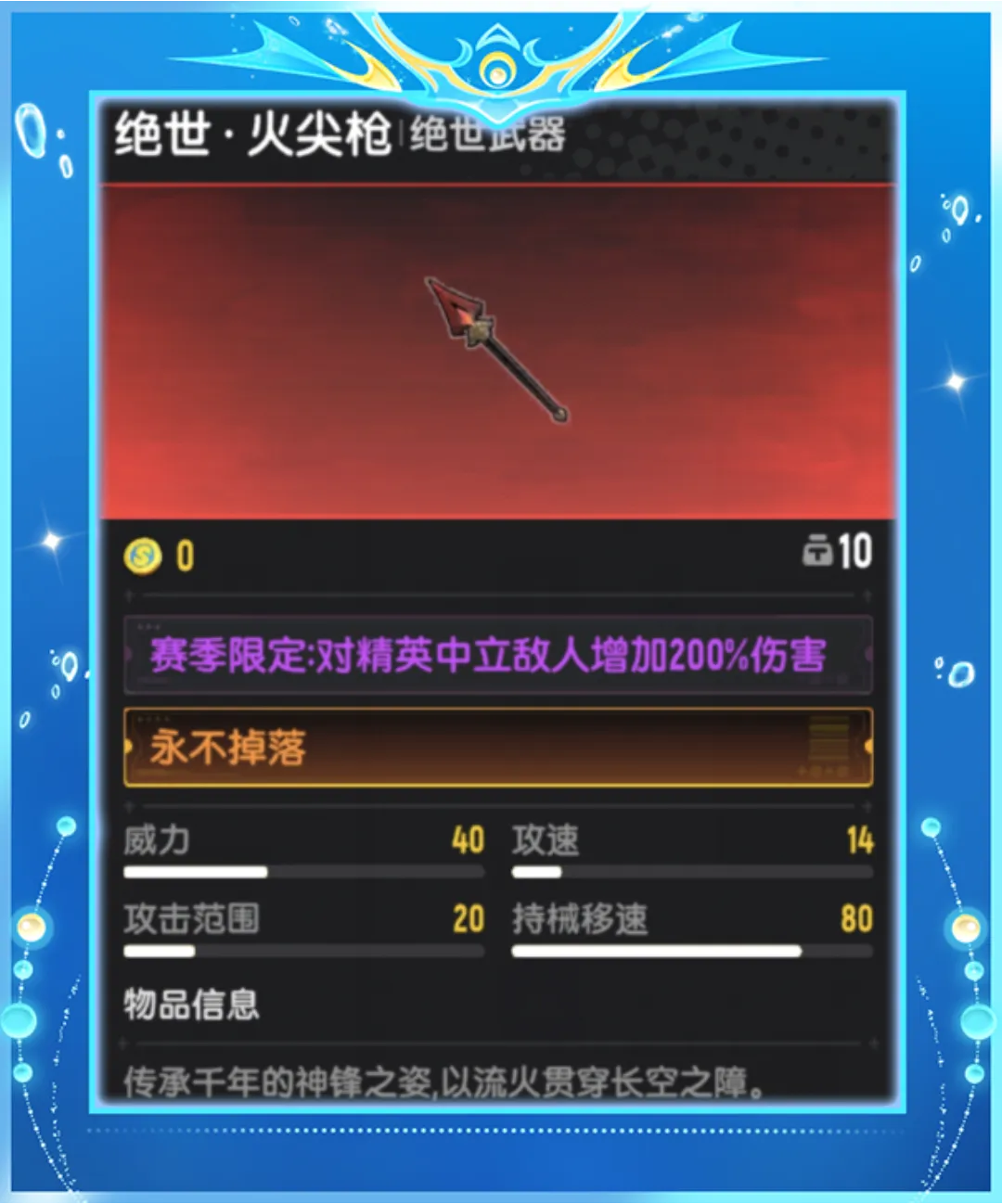 升级激活摸金季票后,肠肠不仅能领取黄金鳄鱼蛋、黄金鸭蛋收藏品、7级防弹衣、7级头盔、7级背包、极限战备券、困难战备券、5级子弹自选包、复制宝库钥匙自选包、复制龙宫宝库钥匙礼包等道具,更可直接获得赛季绝世武器【绝世·火尖枪】