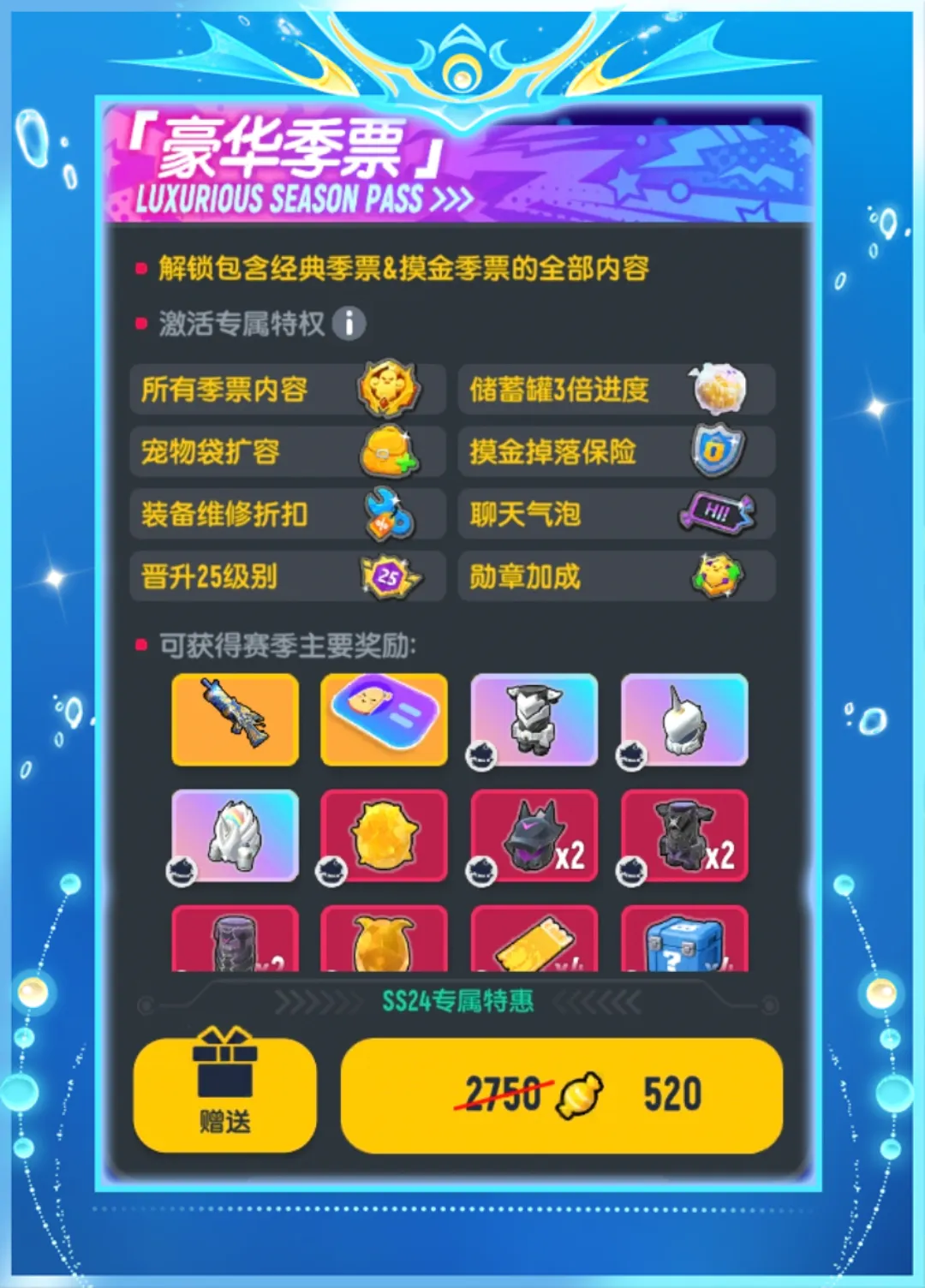 肠肠在季票购买界面购买豪华季票后,可解锁包含经典季票&摸金季票的全部内容以及豪华专属奖励,激活储蓄罐3倍进度、宠物扩容袋、摸金掉落保险、装备维修折扣、聊天气泡、勋章加成、季票等级直接提升25级等专属特权