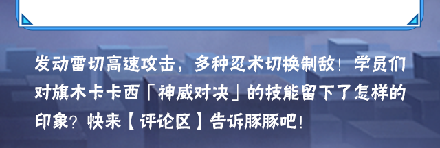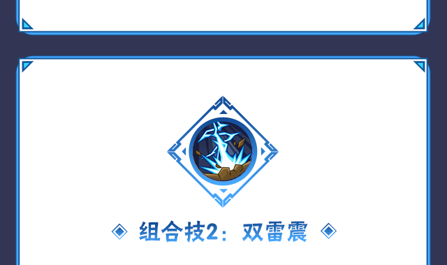 一技能划任意形态的二技能可释放组合技:双雷震,卡卡西快速突进抓取敌人,随后连续斩击敌人升空并留下雷点轨迹,最后凌空劈下一击将雷电切开。结束后获得短暂的雷切苦无强化效果。
