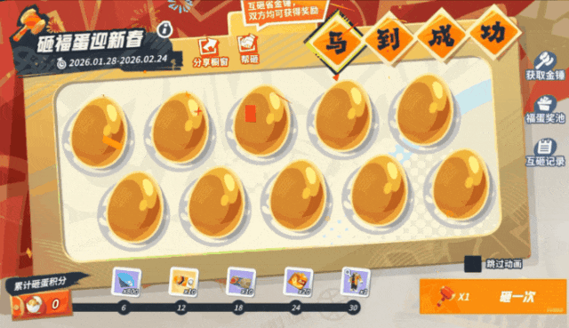 活动共分四个阶段:马、到、成、功。每个阶段开启后,系统都会解锁一扇新的橱窗,每扇橱窗都包含10枚福蛋,玩家点击砸蛋后,系统会随机选择当前橱窗的一枚福蛋去砸。