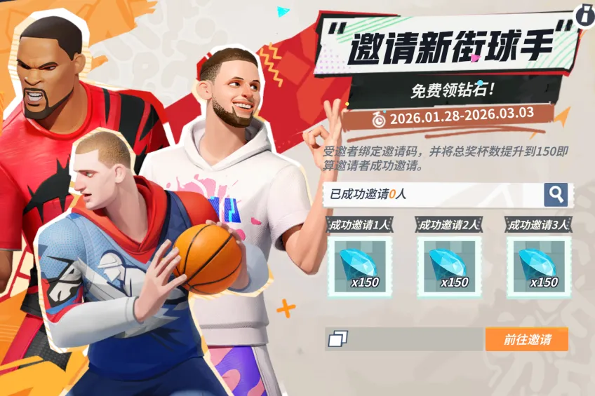 1月28日~3月3日,街球手分享自己的专属邀请码,邀请新玩家进行绑定操作。成功绑定后,受邀者即可领取受邀者奖励:巨星登场券*2。