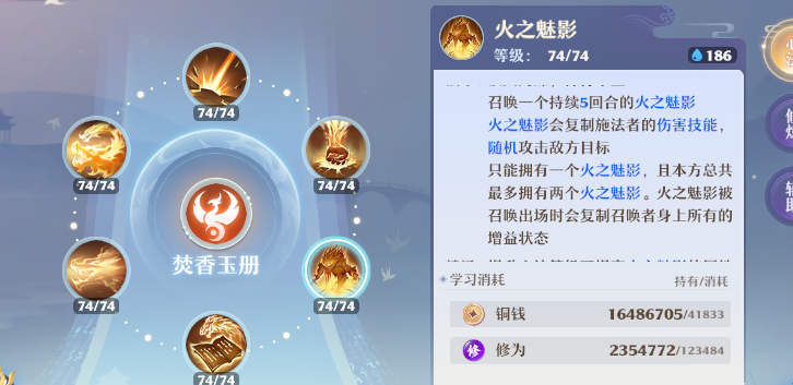 【萤惑】:被动召唤火之魅影,提升其攻击同一目标的概率,与焚香本体技能形成伤害联动;