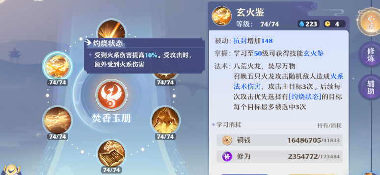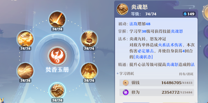 技改后焚香的核心输出逻辑围绕 “暴击触发召唤、持续叠加伤害” 展开:天书开启后,首回合优先释放【炎魂怒】—— 该技能必定暴击,可直接触发【火之魅影】召唤,同时为自身叠加 4 回合【炎魂状态】(提升暴击率),为后续爆发奠定基础;后续回合按战局补放【八凶玄火】(面伤 + 灼烧联动)、【玄火鉴】(多段火系伤害)等输出技能,借助火之魅影的复制伤害能力扩大优势。