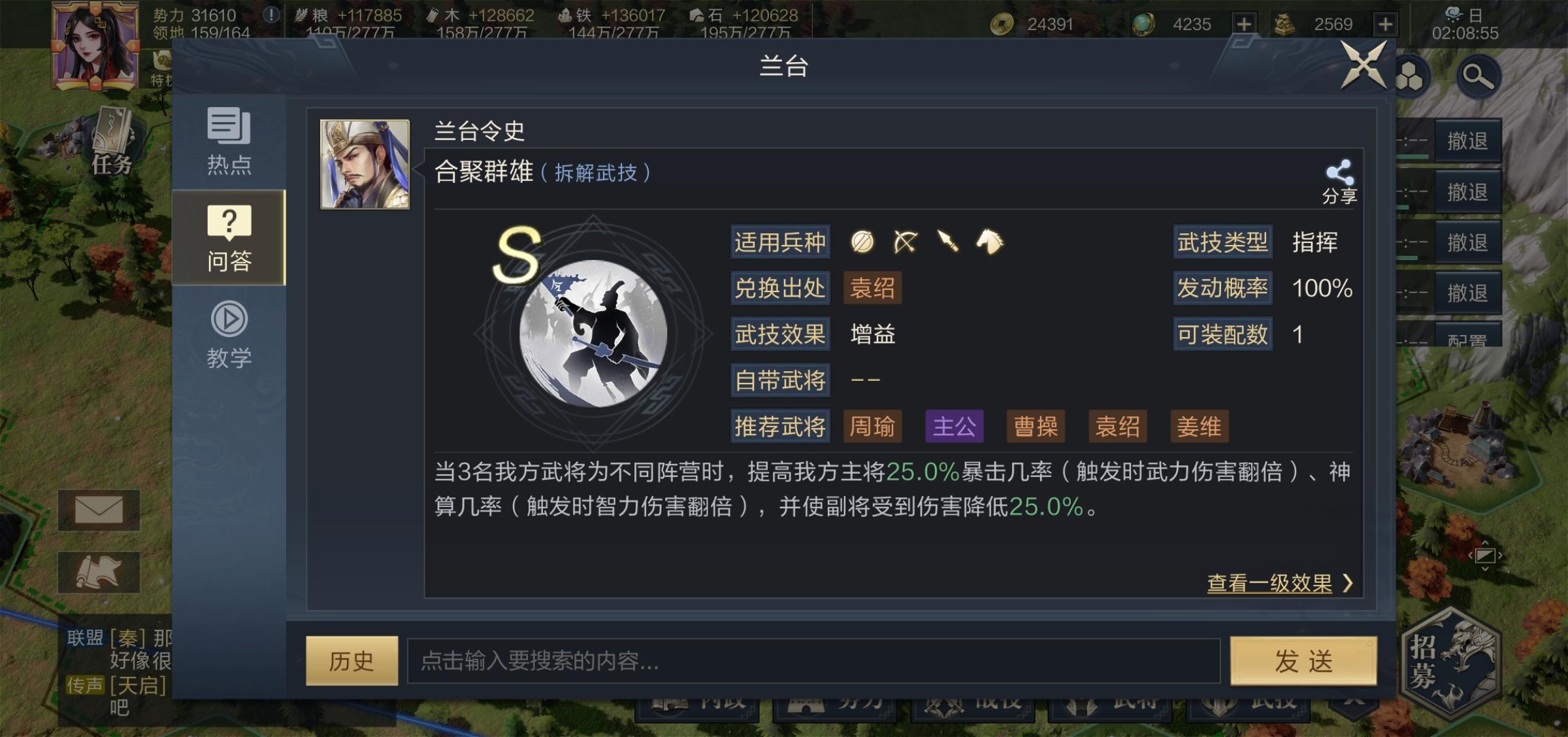 首先就是,没错,黑科技的首席大将,[合聚群雄]!让主将武力和智力伤害都可以暴击,又是绝配!