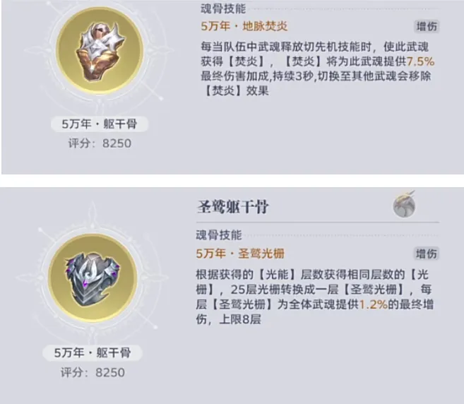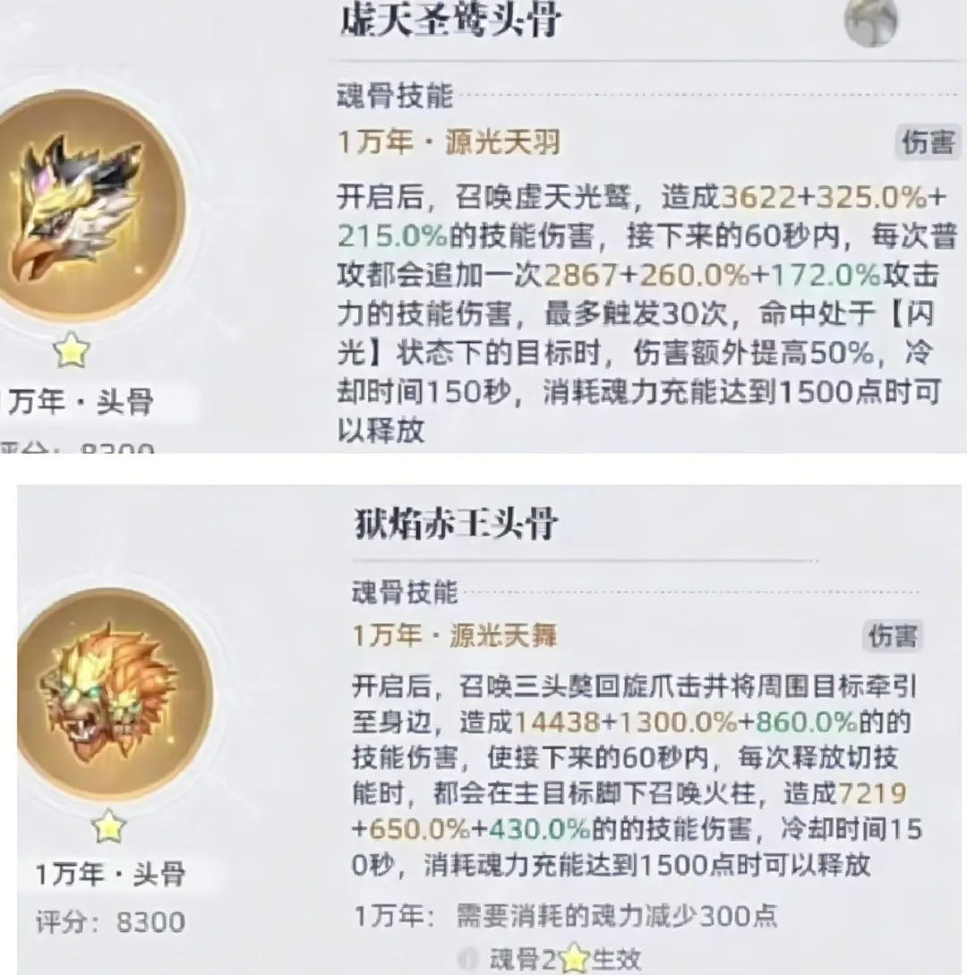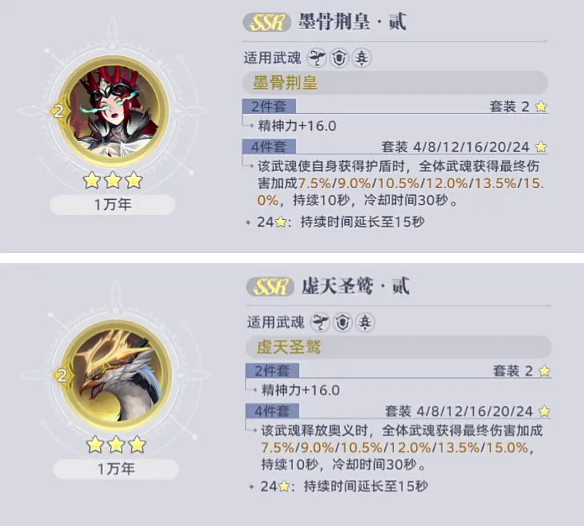 然后便是防控辅类别的两个新魂核套装了,其中“墨骨荆皇”是对于宁荣荣的一个较大增强吧,而“虚天圣鹫”则应该会与焰狼、万妖套装来竞争一个席位吧。