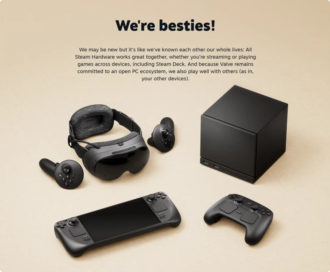 2025年Valve一口气公布了三款新硬件:Steam Machine主机、Steam Frame VR头显和Steam Controller手柄,构成完整生态,预计2026年初发售。
