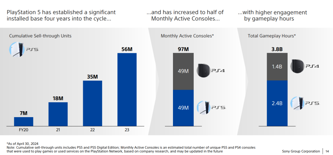 索尼在业务说明会展示的PPT中也出现了关键的指标变化:将核心KPI从单纯的“Unit Sales(主机销量)” 转向“Active Users(活跃用户)”和 “Play Time(游戏时长)” 。