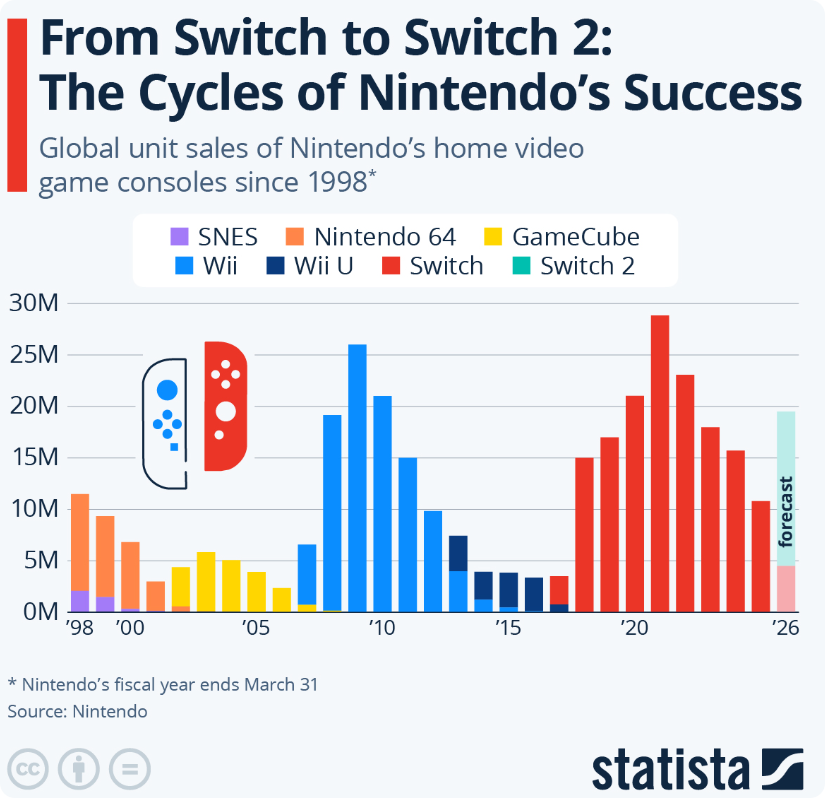 任天堂在2025年成功推出了新设备,Switch 2发售4天全球销量就突破350万台,使得任天堂将本财年(截至2026年3月)的销量预期从1500万台上调至1900万台。