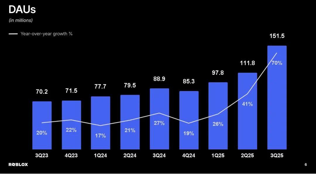 2025年是 Roblox 的全面进化之年。这一年,Roblox 的日活跃用户数增长迅速:从Q1财报的9780万迅速攀升至Q3财报的1.515亿。