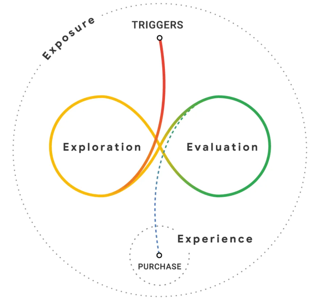 在“触发”(Trigger)和“购买”(Purchase)之间,消费者像是在一个游乐场中反复横跳,不断进行探索(Exploration,做加法)和评估(Evaluation,做减法)。