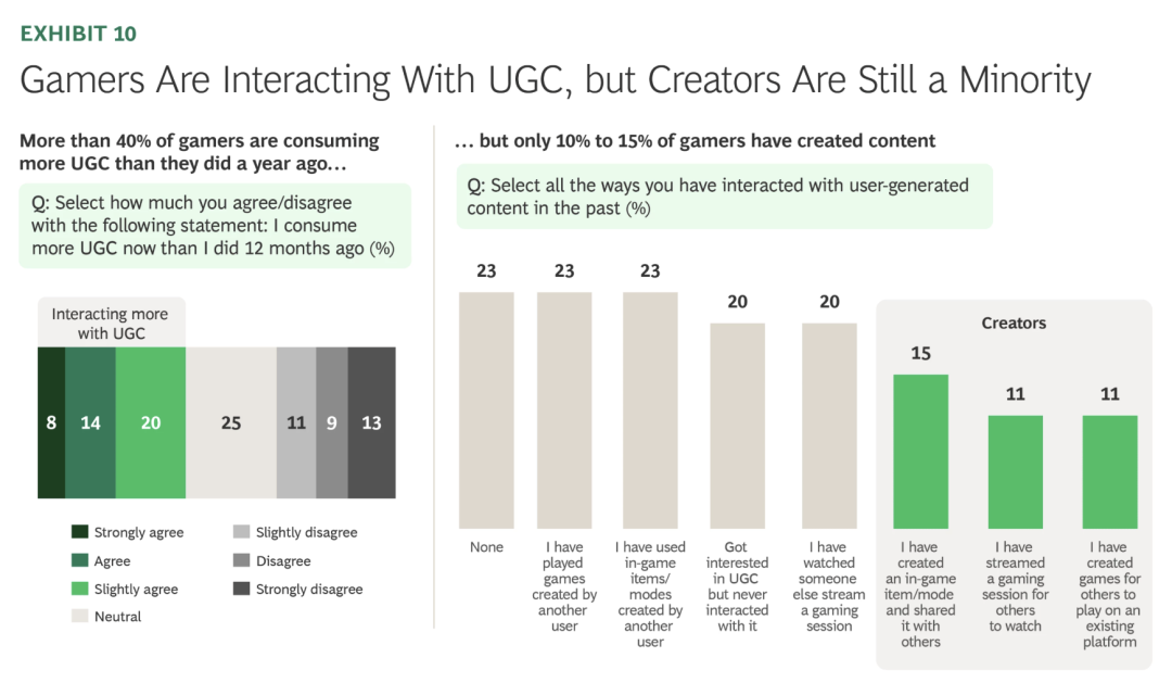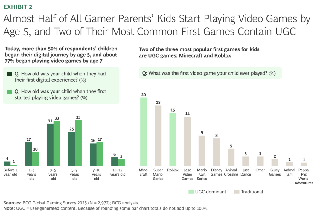 根据波士顿咨询公司的调查,77%游戏玩家的子女最晚7岁就开始玩电子游戏,而其中很多孩子接触的第一款游戏,就是《我的世界》或者是《Roblox》这样有丰富UGC内容的产品。在他们的影响和引导下,UGC或许会成为未来游戏的出厂标配。