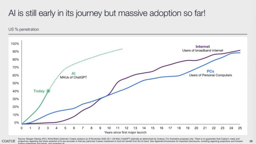数据显示,AI工具在用户中普及的速度,远超当年的个人电脑和互联网。