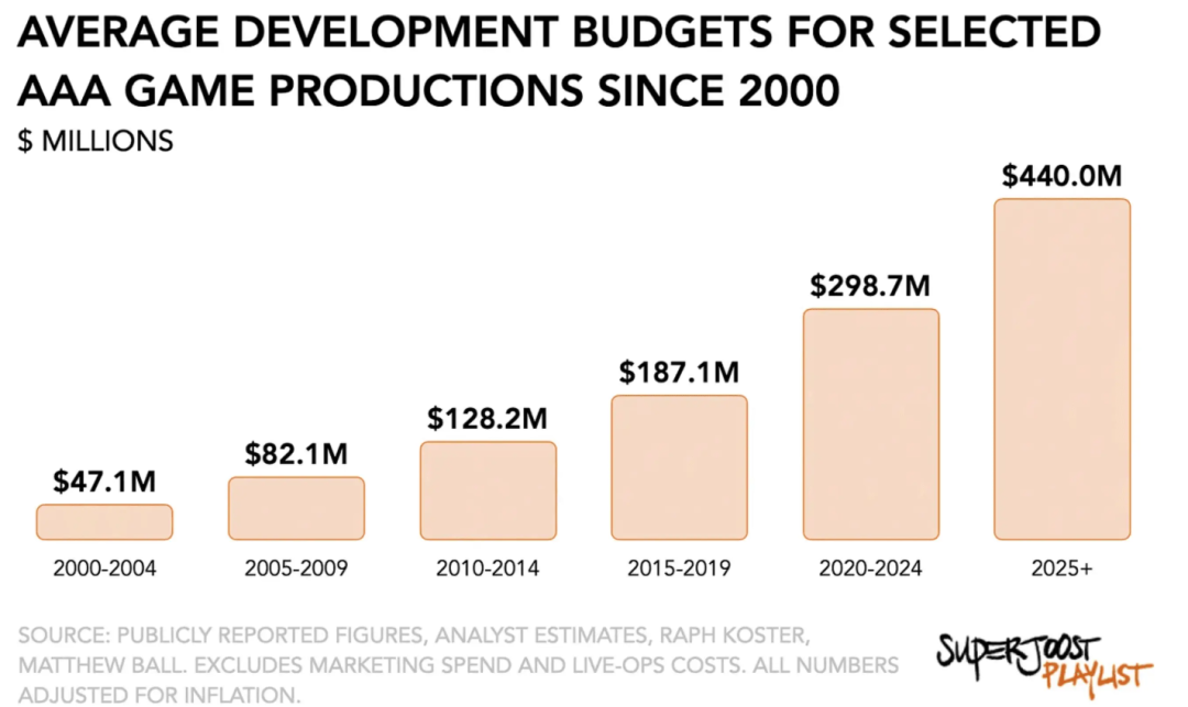 曾被资本视为避风港的 AAA 大作,如今已不再是“安全牌”。根据行业报告,2025年全球发布的AAA游戏平均开发成本已超过2亿美元,但首月回收成本的比例却从十年前的70%下降至不足40%。GDC(游戏开发者大会)的年度行业状态报告也显示,超过60%的开发者认为当前3A开发模式不可持续。
