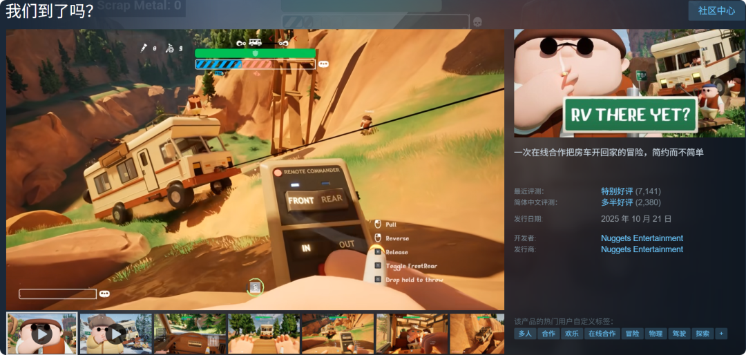 《RV There Yet?》:一款公路灾难模拟器。最多四名玩家需共同驾驶一辆破旧的房车(RV)穿越极端地形。北美标准售价7.99美元,总计销量已经突破500万份。