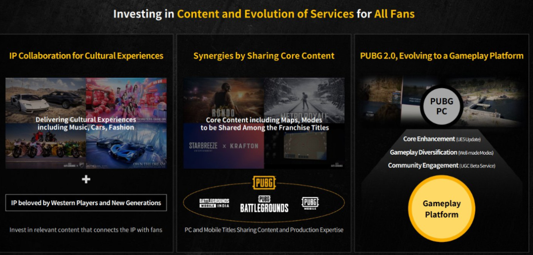 Krafton官宣了《PUBG 2.0》计划,除了将游戏升级到UE5引擎和添加更多游戏玩法以外,还将会对UGC内容提供更多支持。同时,集团还启动了面向全球内容创作者的激励计划“Krafton Creator Network(KCN)”,当官方创作者的粉丝在Krafton旗下游戏内消费时,只要输入创作者特有的代码,相应的创作者就将获得这些消费所创造的净收入的至少5%作为奖励。