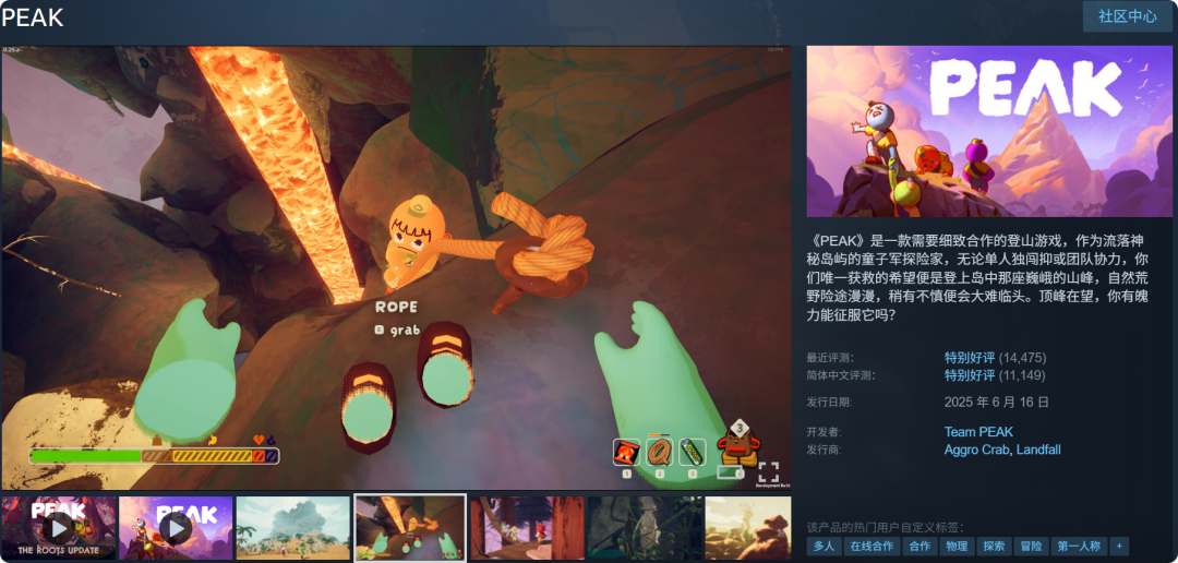 《Peak》:2025年的年度黑马。最多四名玩家扮演一群童子军(Scouts),试图攀爬一座每24小时地形重置一次的神秘高山。北美标准售价7.99美元,总计销量已经突破1000万份。