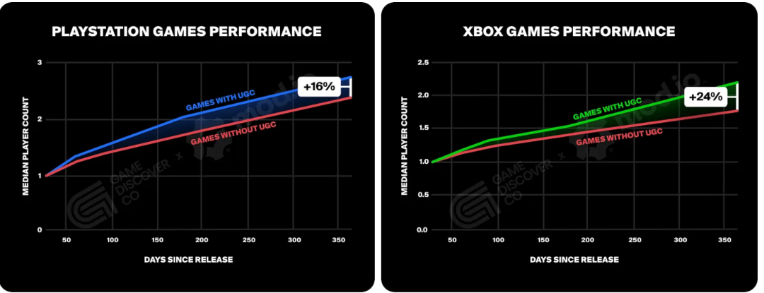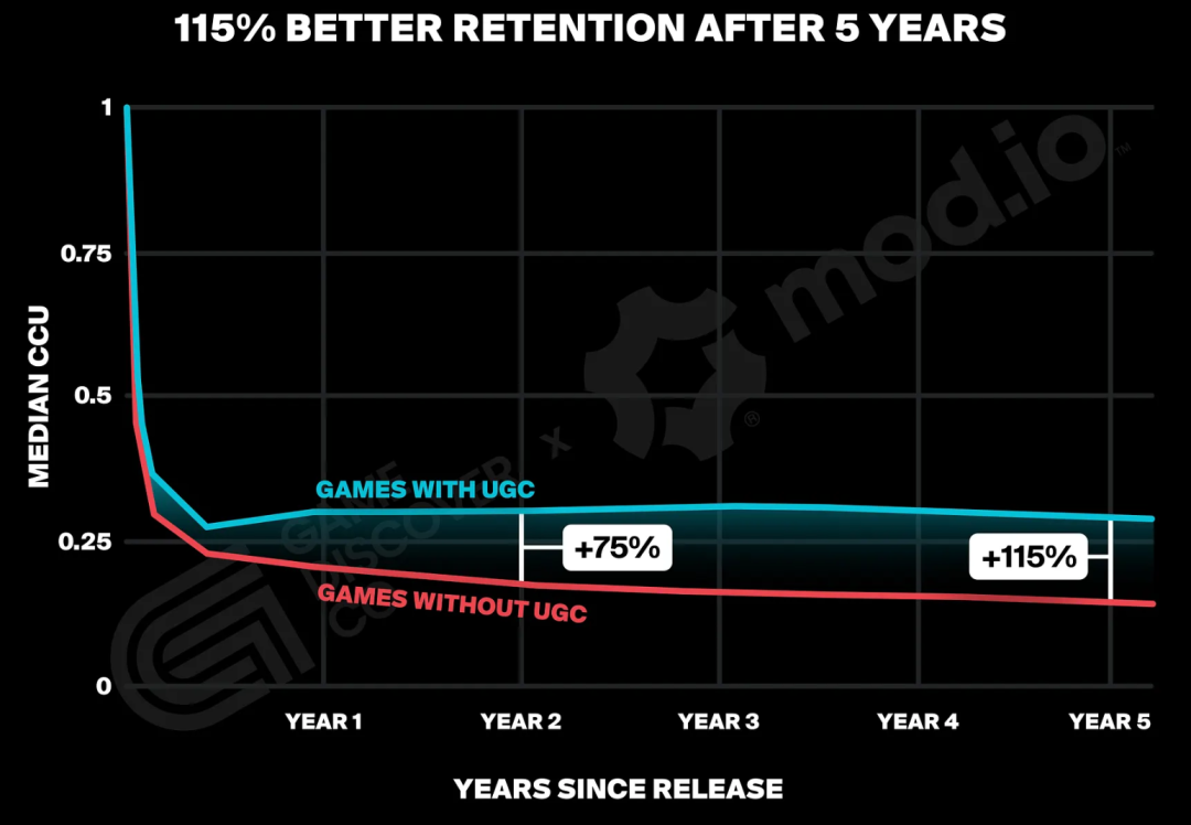 2025年,mod.io 与 GameDiscoverCo 的联合研究揭示了一个有趣的情况:在 Steam 首月收入破百万美元的 1200 款游戏中,仅有不到20%的游戏官方支持 UGC,但正是这少量的游戏,展现出了惊人的生命力——支持UGC的游戏的长期收入与留存率明显优于不支持UGC的游戏,且随着时间的推移,这个差距也在逐步扩大。