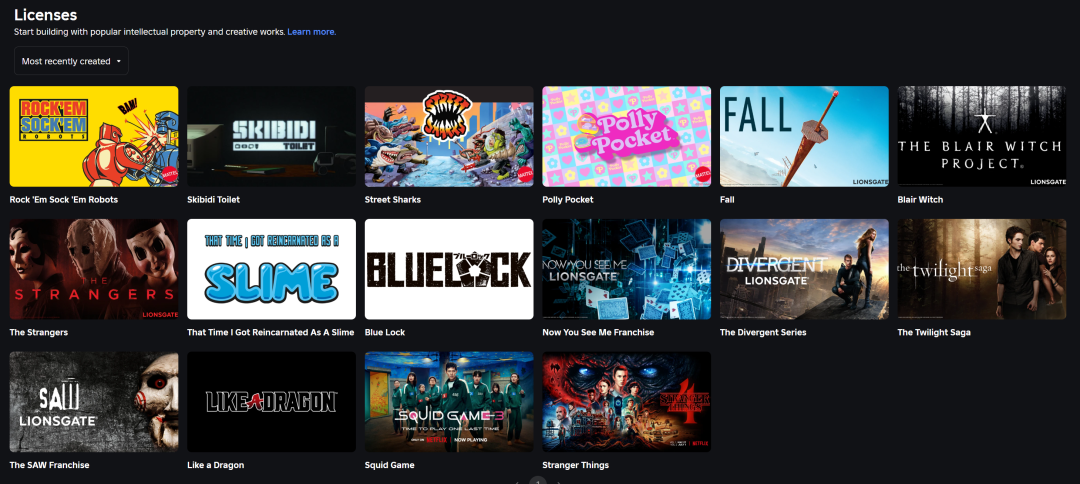 为了实现这一野心,Roblox不但携手谷歌推出奖励视频广告,大幅提升变现能力;还推出了自助式IP授权平台,让创作者能便捷地使用多个知名IP,比如《鱿鱼游戏》《怪奇物语》《南方公园》《电锯惊魂》《惊天魔盗团》《暮光之城》等;它甚至还集成了Shopify,和各类品牌合作,直接切入电商领域。