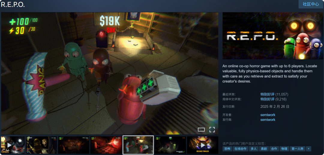 《R.E.P.O.》:最多六名玩家在废弃星球回收物资,运送至回收点换钱逃生。它巧妙融合了恐怖氛围与软体物理引擎带来的滑稽感——看着队友被怪物以诡异的姿势拖走,恐惧瞬间转化为爆笑。北美标准售价9.99美元,总计销量已经突破1000万份。