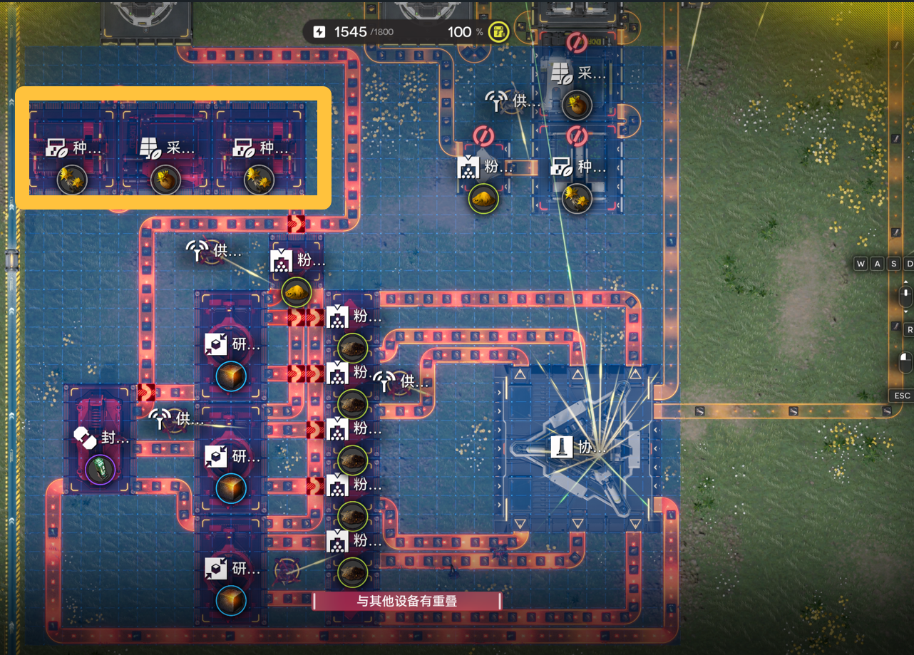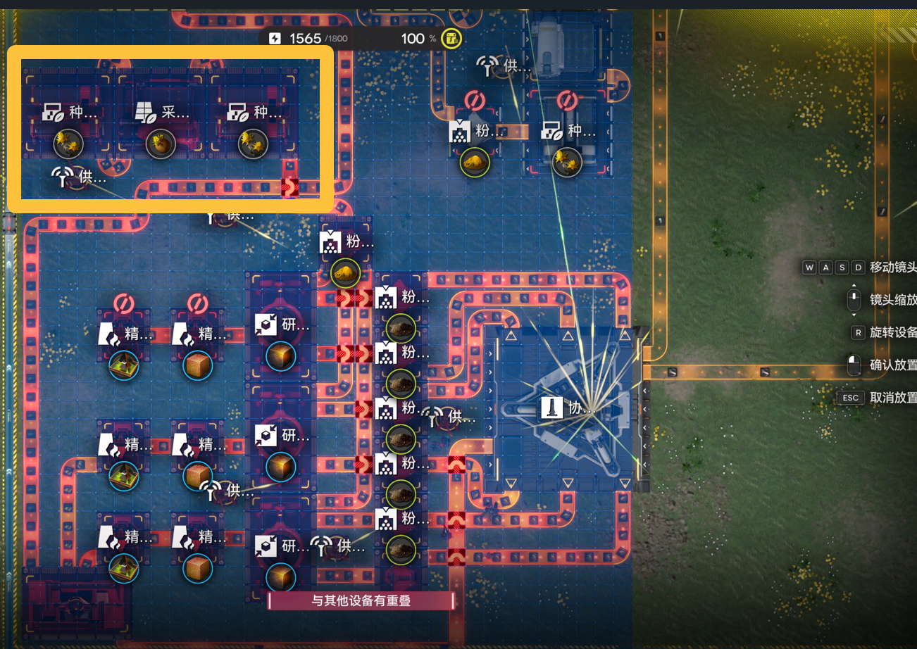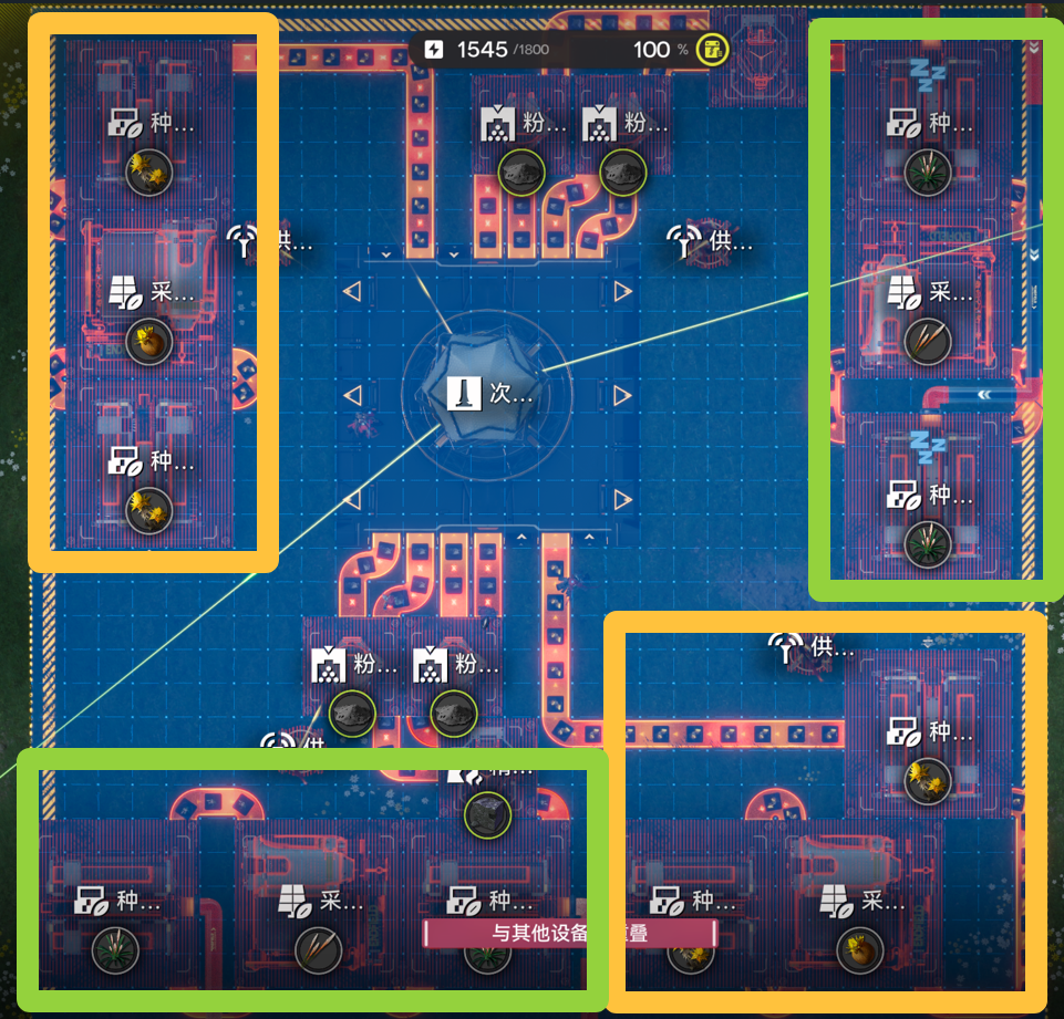 绿色区域内的采种机装填芽针,黄色区域内的采种机装填砂叶。(尽量多放,只放几个会导致设备睡觉效率不够,下同)