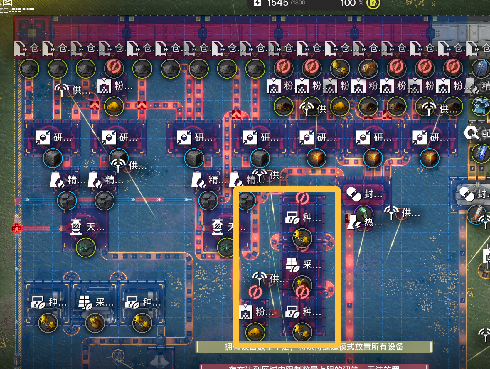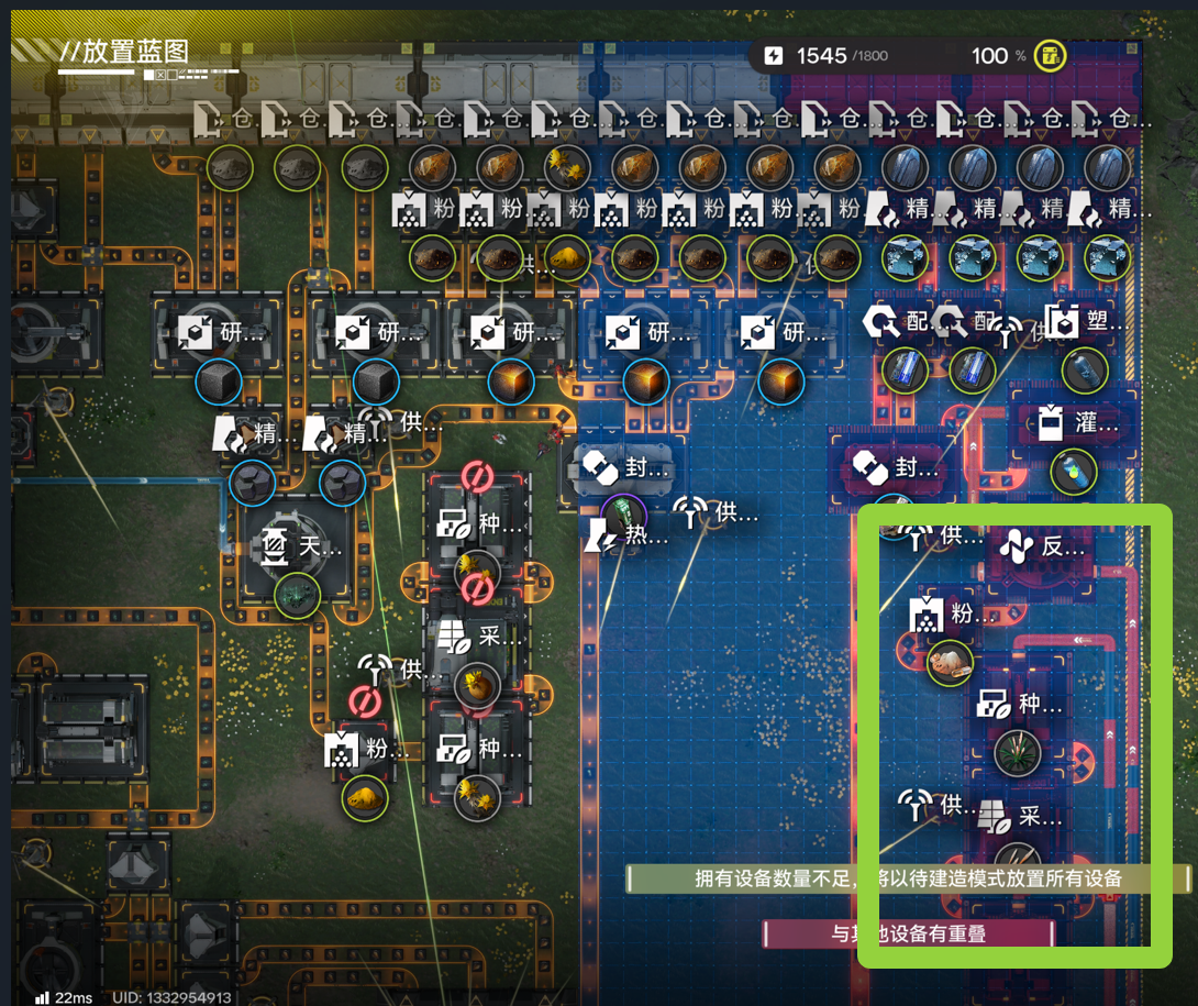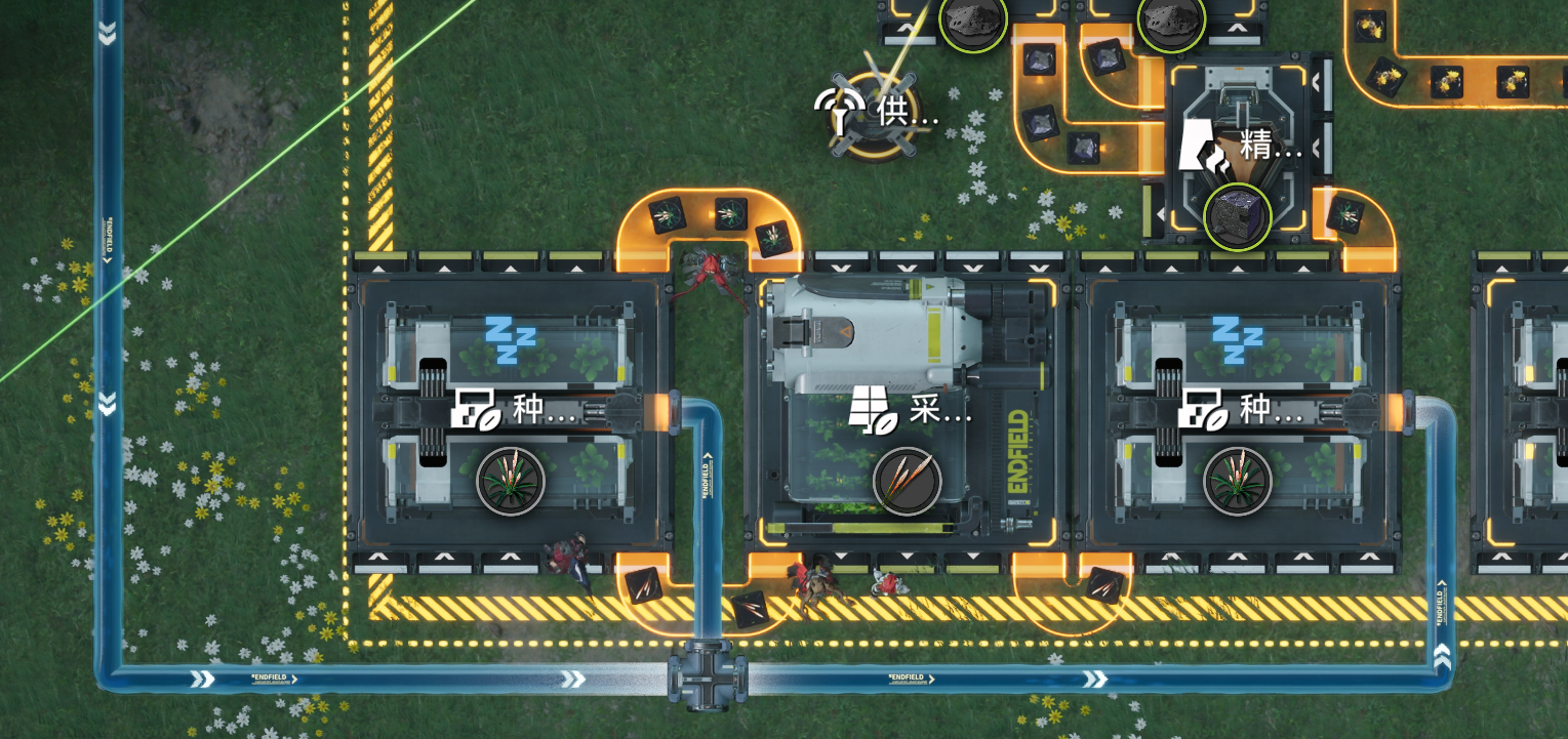 绿色区域内的采种机装填芽针,黄色区域内的采种机装填砂叶。(尽量多放,只放几个会导致设备睡觉效率不够,下同)