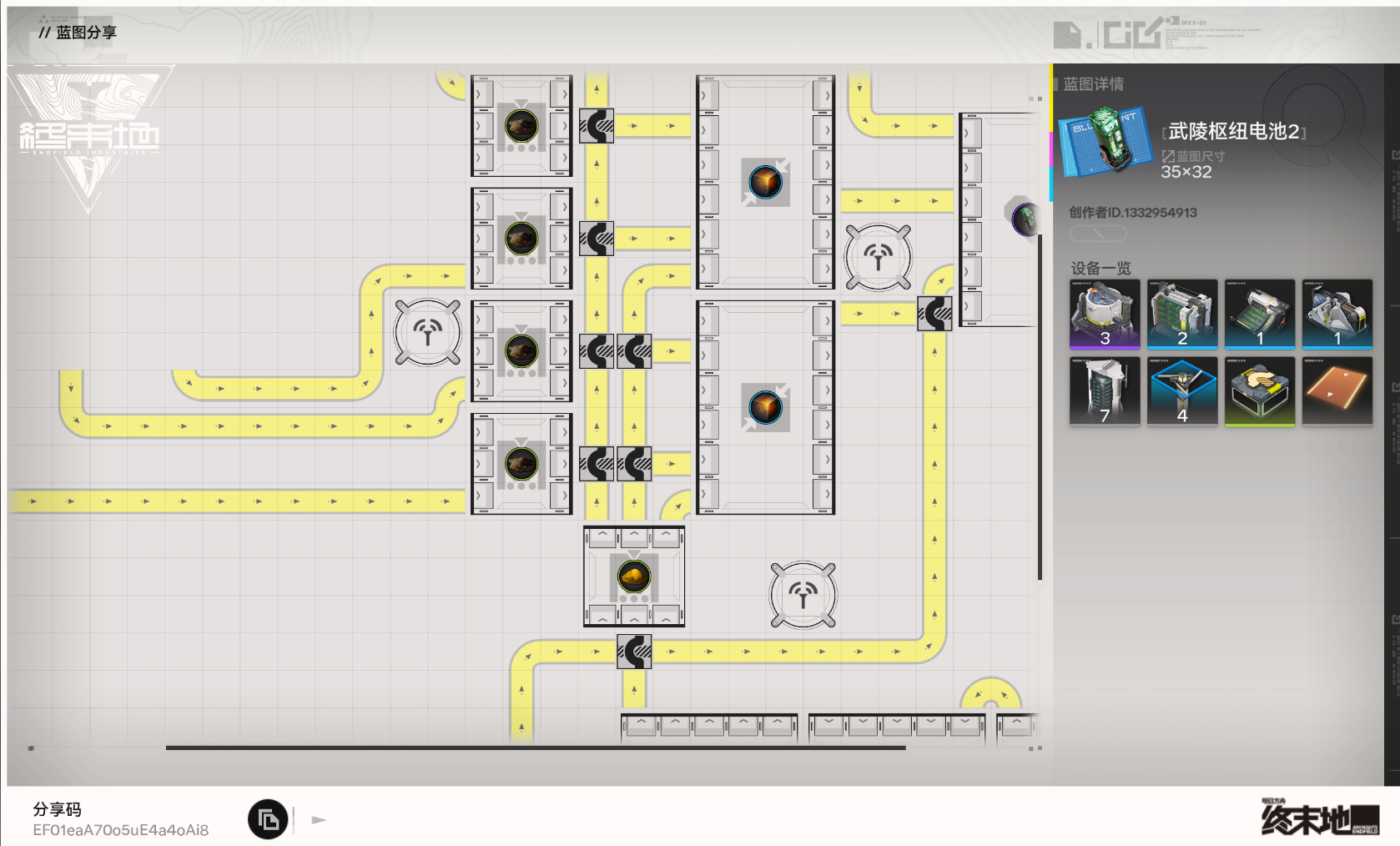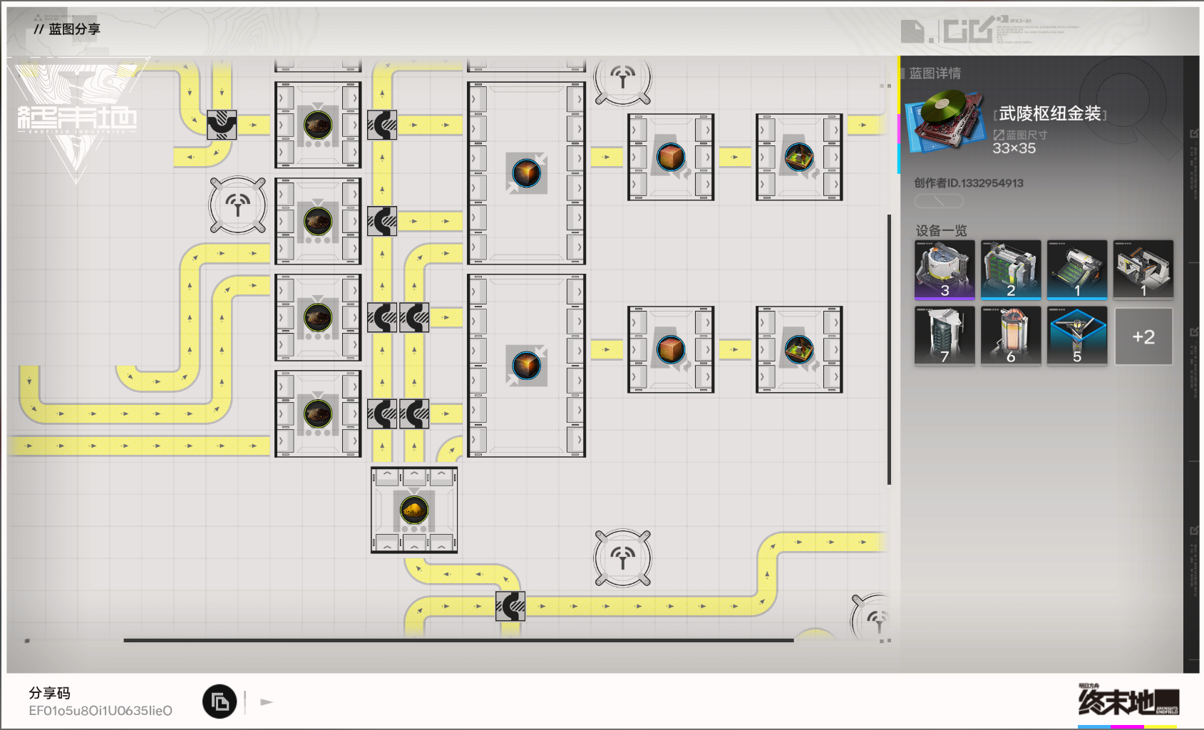 《明日方舟:终末地》蓝图分享码 EF01Oe4E7ao63I3U9oe4 请复制后前往游戏中使用。