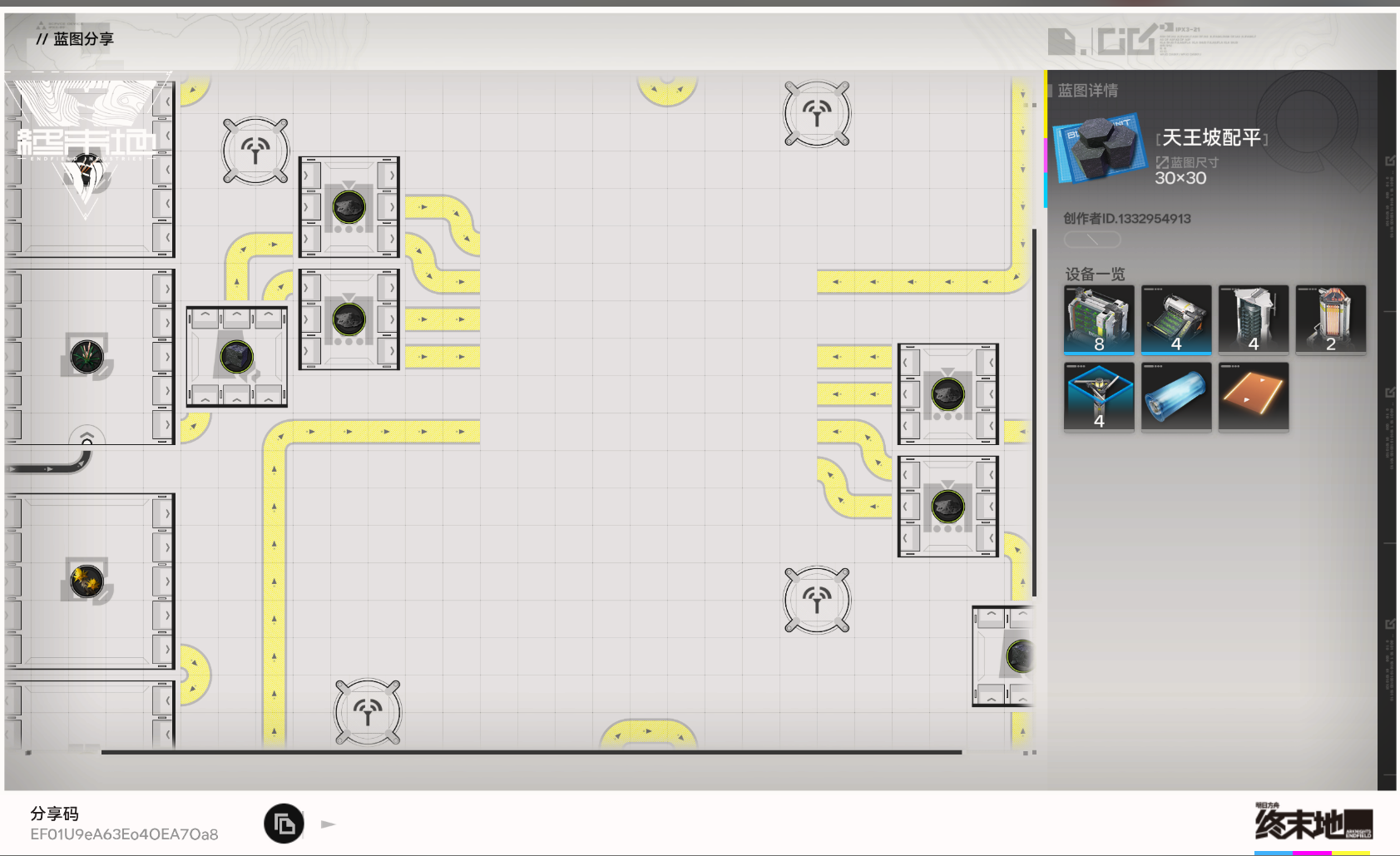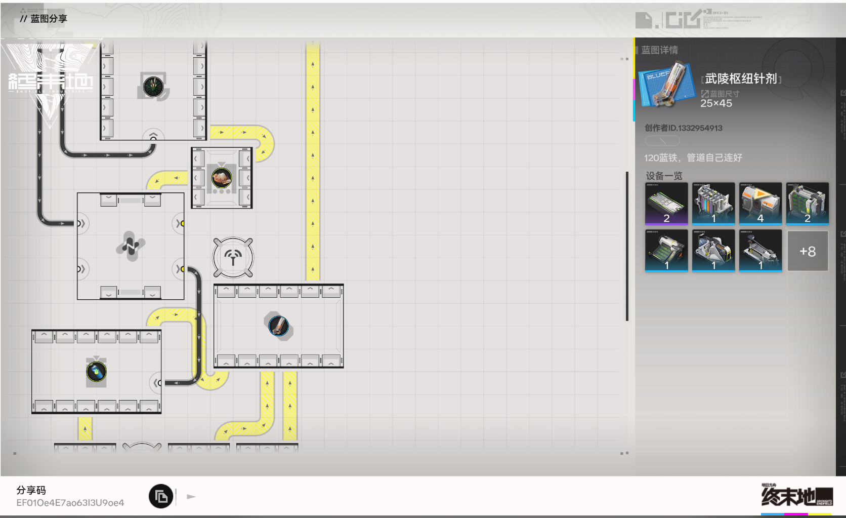 《明日方舟:终末地》蓝图分享码 EF01U9eA63Eo4OEA7Oa8 请复制后前往游戏中使用。