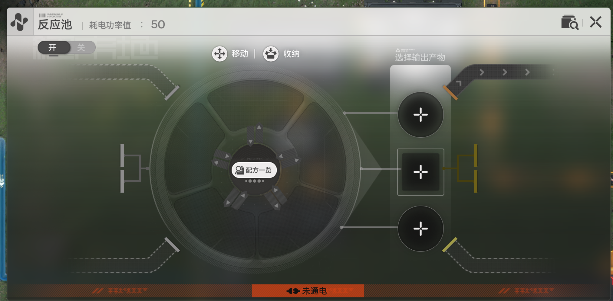 开始抄作业时,摆放完天王坪基地后,在天王坪基地任意空闲出料口按图示摆上一个分流器和两个电厂,出料口货物选择高级谷地电池,然后自己到帝江号打开背包,通过来回切换地区仓库的方式,向武陵地区至少运输200个高级谷地电池(约能支撑1小时多的发电,保证基建正常供电)