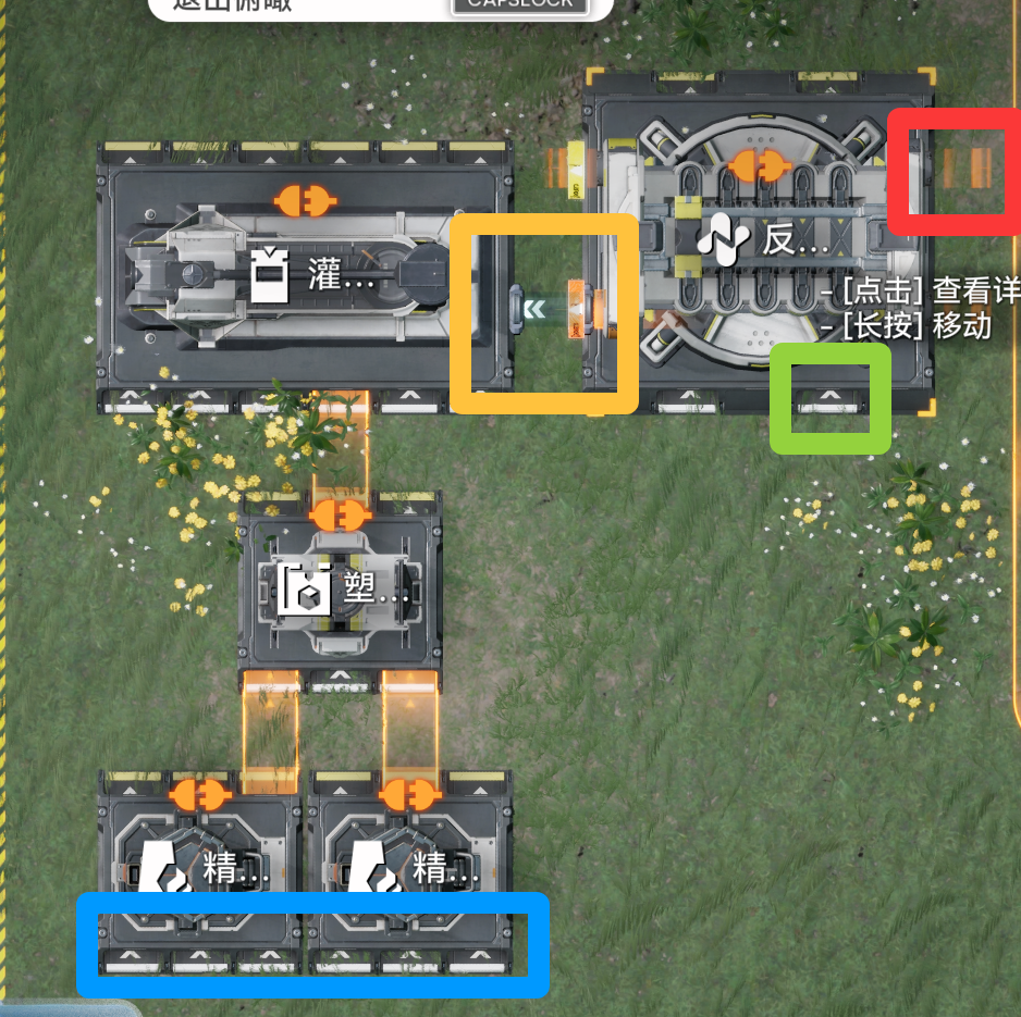 蓝框两个精炼炉需分别输入蓝铁、绿框输入息壤、红框管道水泵输入清水、如果出料口链接正常后灌装机仍然睡觉不工作,检查黄框处是否有管道链接,并点击反应炉打开界面,点击右方的上面的圆圈加号,选择液化息壤作为输出即可(按理来说我都设定好了应该不会出现这个问题)