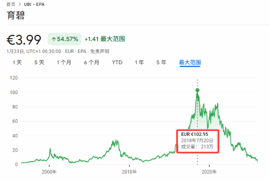 可能很多玩家对6.49亿这个数字没什么概念,在2018年下半年时,育碧的市值来到了公司上市以来的巅峰:总市值约100亿欧元,单股股价在90-95欧元附近浮动。