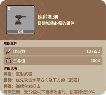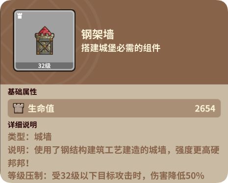 ◆ 城堡的三大基石 ◆你的第一座城堡,将由三个核心部分自由构成:1、坚固之盾:城墙定位:城堡的第一道生命线,所有防御的根基。作用:拥有独立生命值,能为你后方的武器和士兵抵挡大量伤害。等级提升后,不仅防御力飙升,外观也会越发宏伟霸气,让你从“简陋木寨”进阶为“钢铁要塞”!策略:如何布局城墙,分割战场,引导敌人,是你需要考虑的第一课。