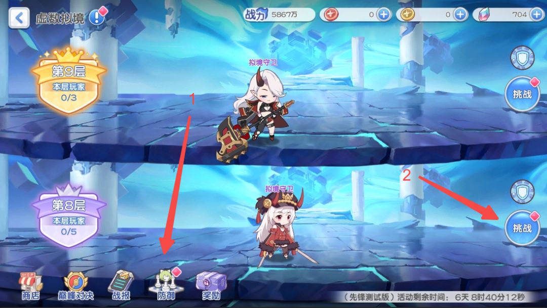 1、参与挑战前,需先点击界面下方的【防御】按钮,配置专属防御队伍后才可发起对战。