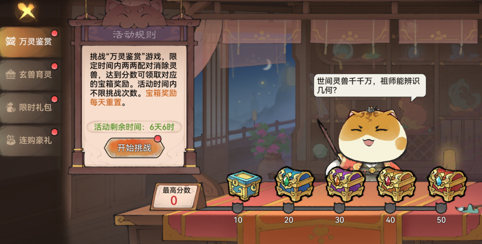 另外,在初次解锁灵兽玩法时宗门还会开启【万物有灵】活动,祖师通过参与活动挑战和培养灵兽可获取天罡灵兽袋、太初育灵露等道具。