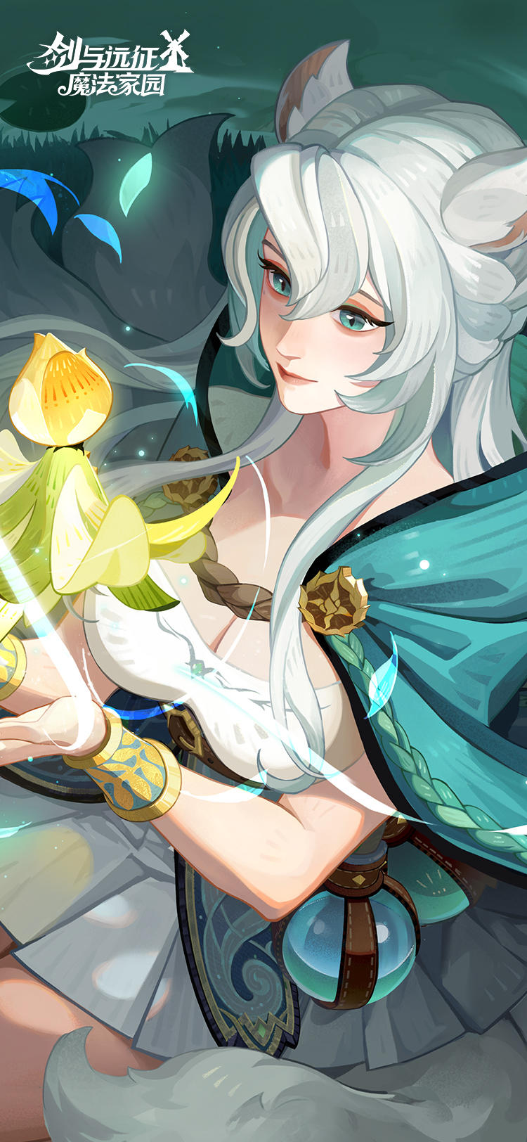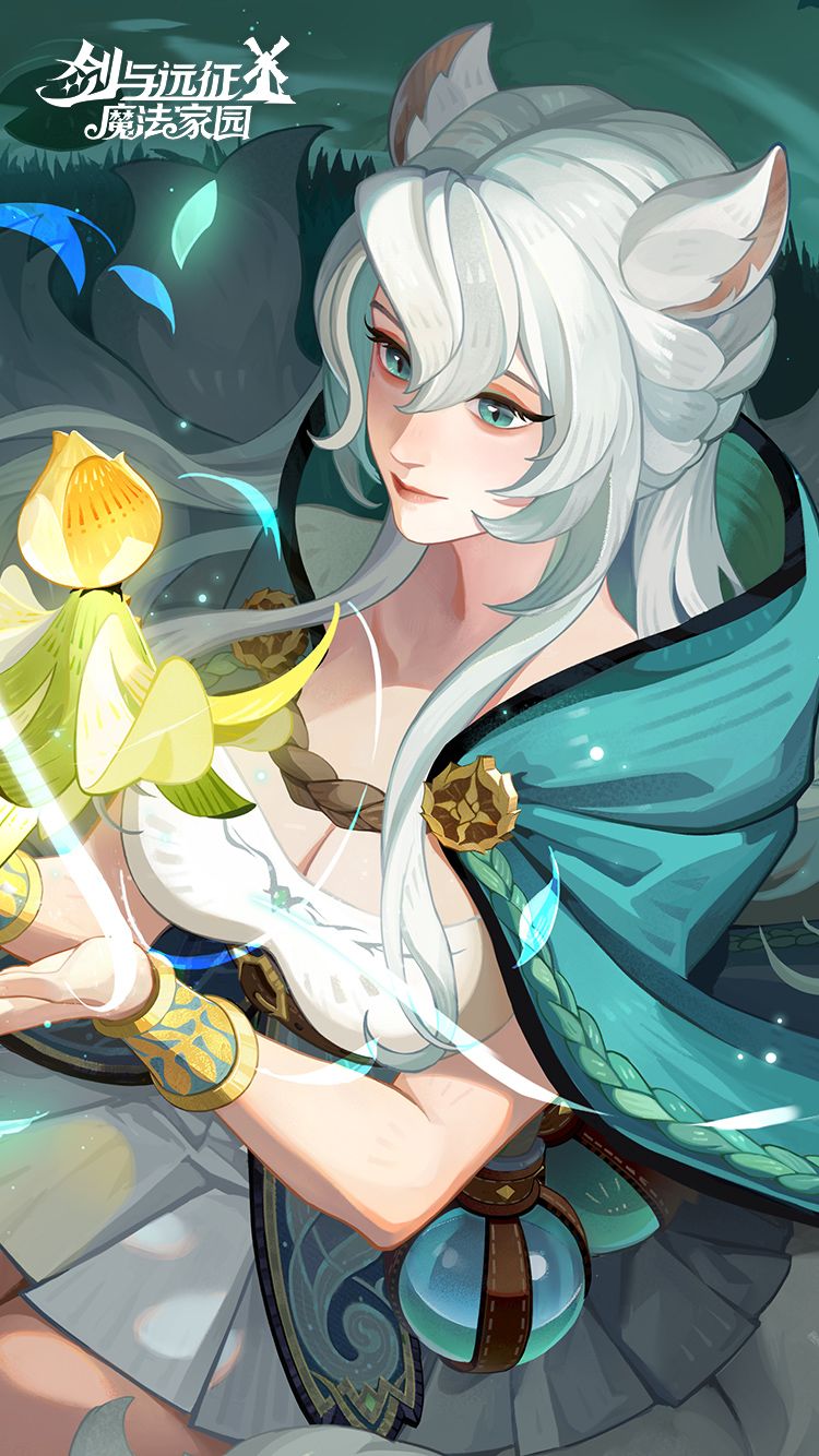 娑丽丝跪坐在丛林中,凝望着掌心绽放的魔法植物。她的银发兽耳与蓬松的尾巴在林风里轻晃,和流动的蓝绿魔法光晕温柔交织,仿佛要将森林的暖意与治愈,都揉进这束光里,传递给每一个迷茫的灵魂。