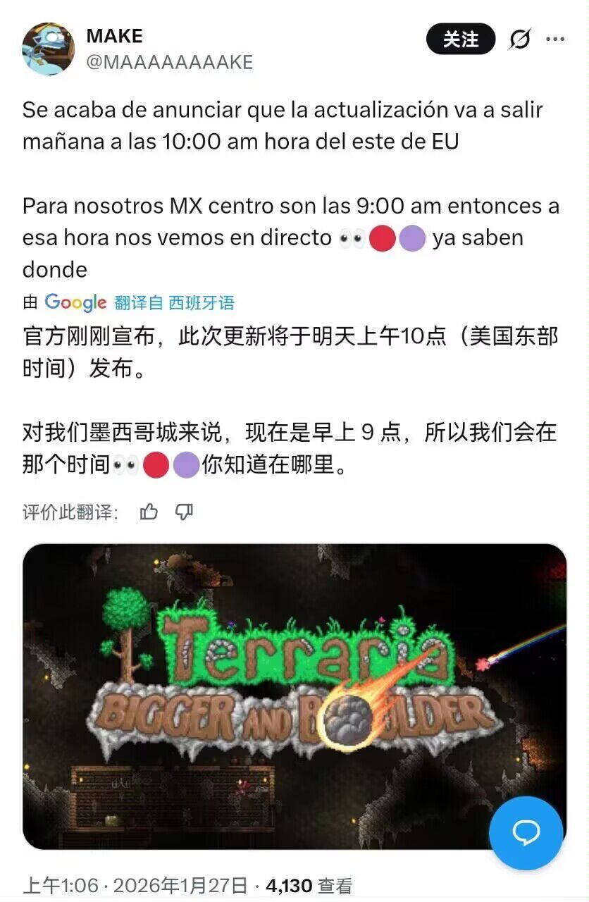 我们都知道,《泰拉瑞亚》是一款由美国Re-Logic公司开发的游戏,因此其官方发布的时间信息通常以美国当地时间为准。具体来说,这次1.4.5版本的全平台更新时间,官方公布的是美国纽约时间1月27日上午10点。