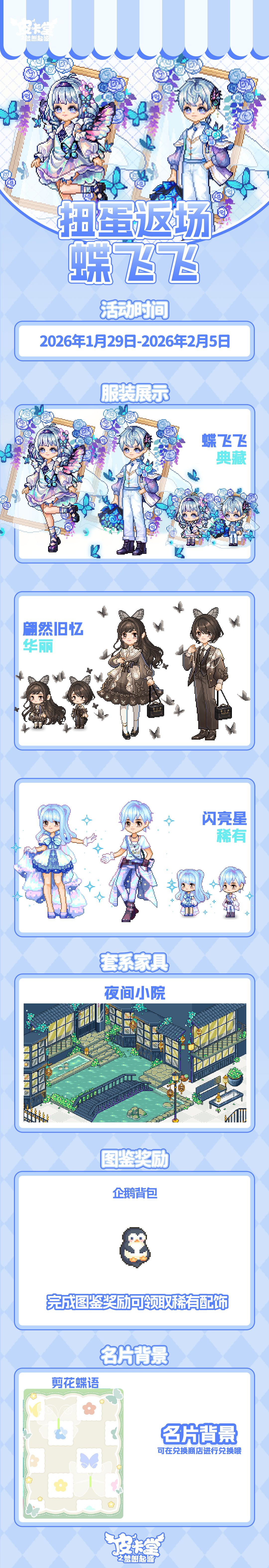 -【限时金币扭蛋】返场!可使用限时扭蛋券/金币抽取,参与可获得典藏套装「蝶飞飞」、华丽套装「翩然旧忆」、稀有套装「闪亮星」,套系家具「夜间小院」!完成图鉴收集任务可获得配饰「企鹅背包」!