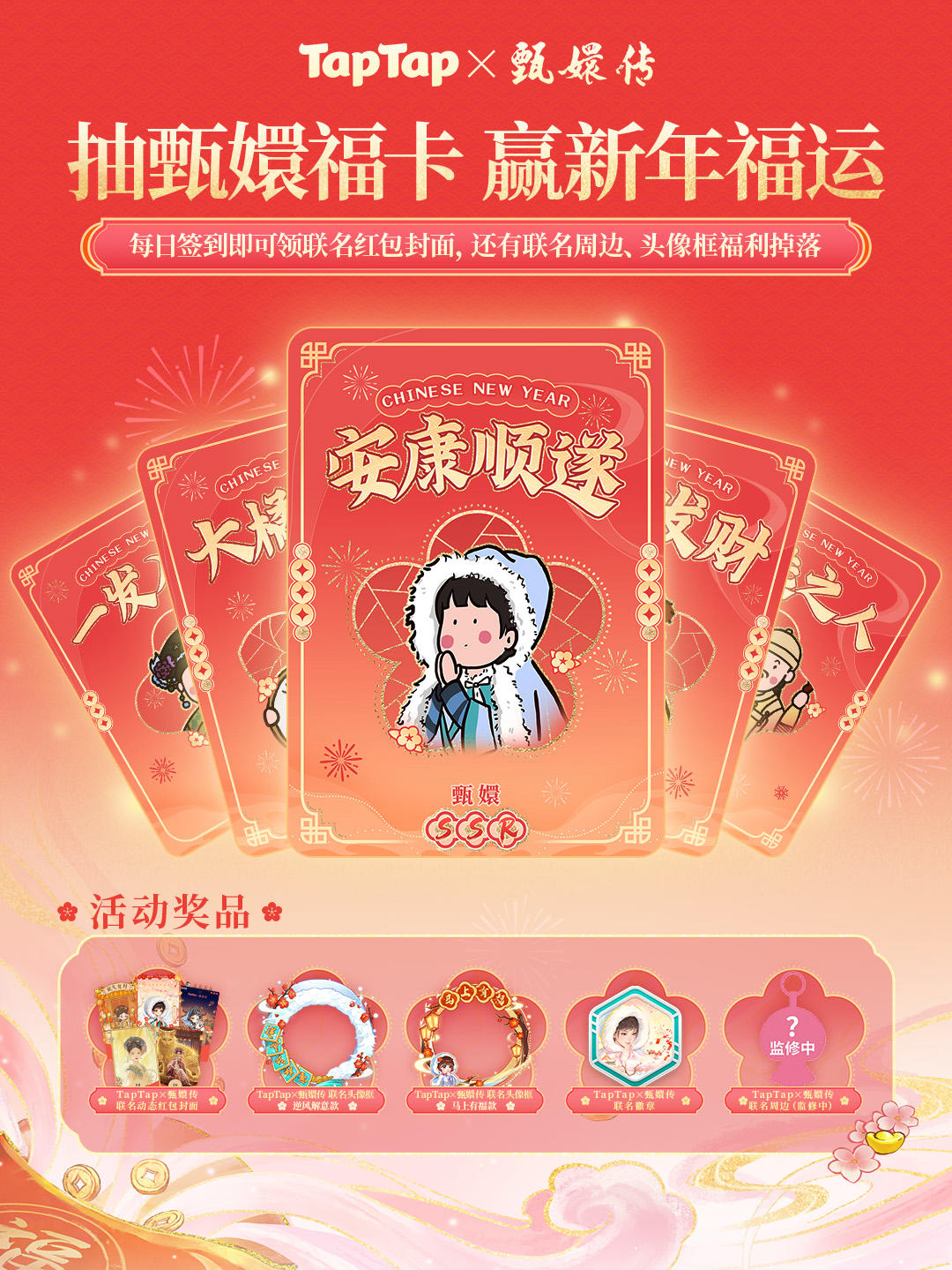 即日起至2月23日,每日签到即可领取游戏新春红包封面、TapTap×甄嬛传 「甄好玩」联动新春礼!