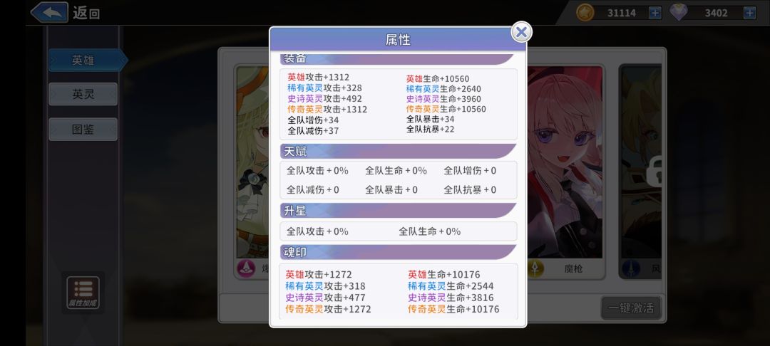 养成方面:主城等级、圣殿图釜、天赋树、魂印是基础,无脑升级就行了,魂印提一嘴,即便升的角色不上场、不进队,也能享受到加成。