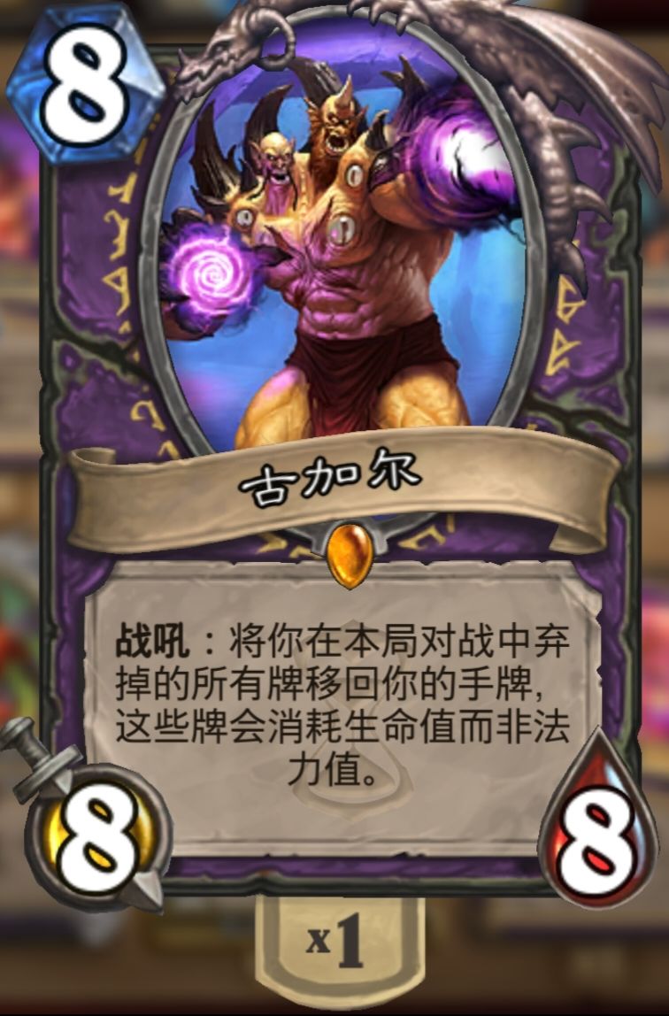 只要能回手弃掉的古加尔,利用效果就能将本局弃掉的所有卡回手,包括他自己,而古加尔回手的卡消毫血量而非费用,加上阿迦玛甘使下一张卡消毫对手血量